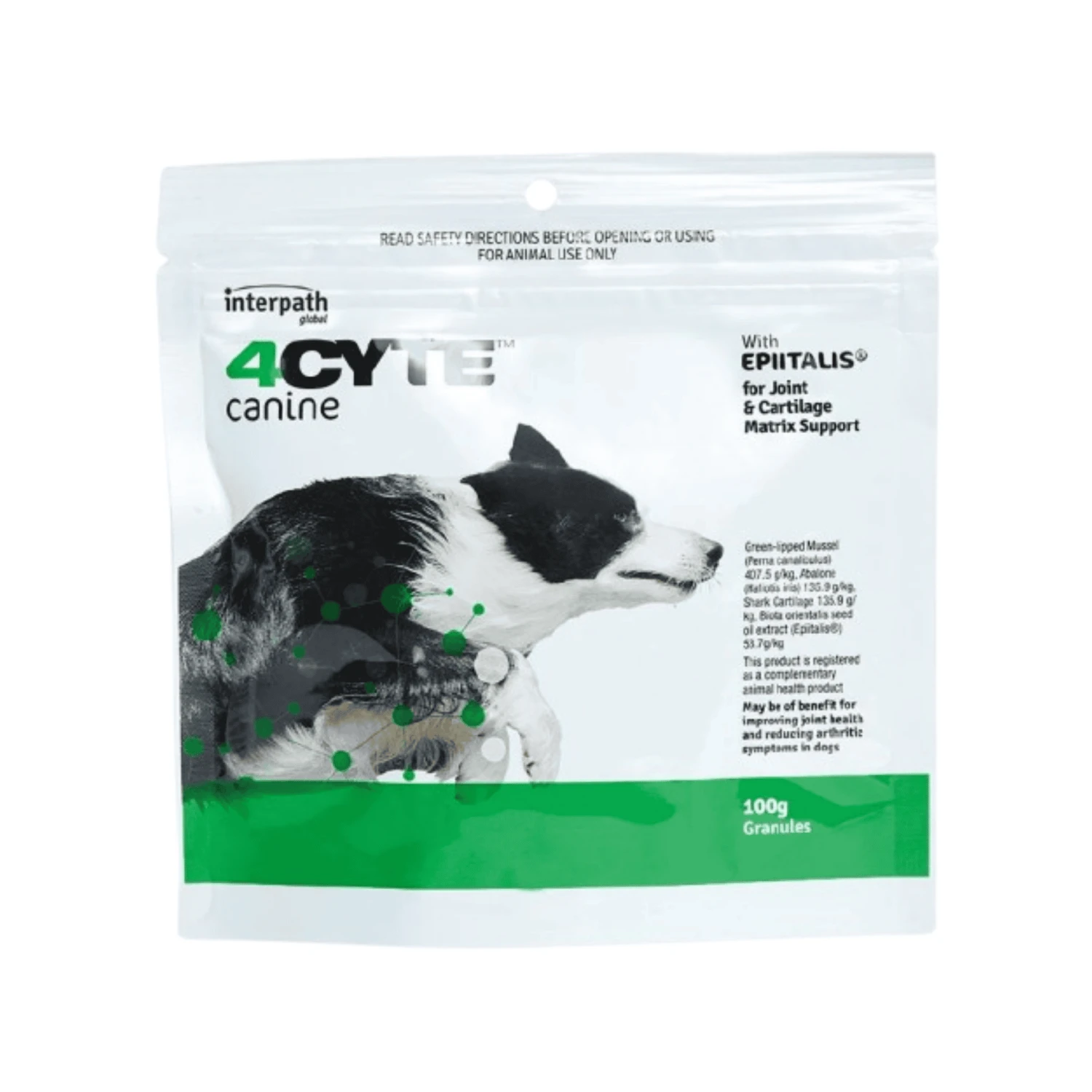 4CYTE Granules for Dogs contains Epiitalis®, a unique advancement in joint treatment containing a proprietary plant oil extract, patented for its ability to proliferate chondrocyte cells in the presence of inflammation. It can also be used in large breeds, working or athletic dogs to support the pathological pathway of joint health.