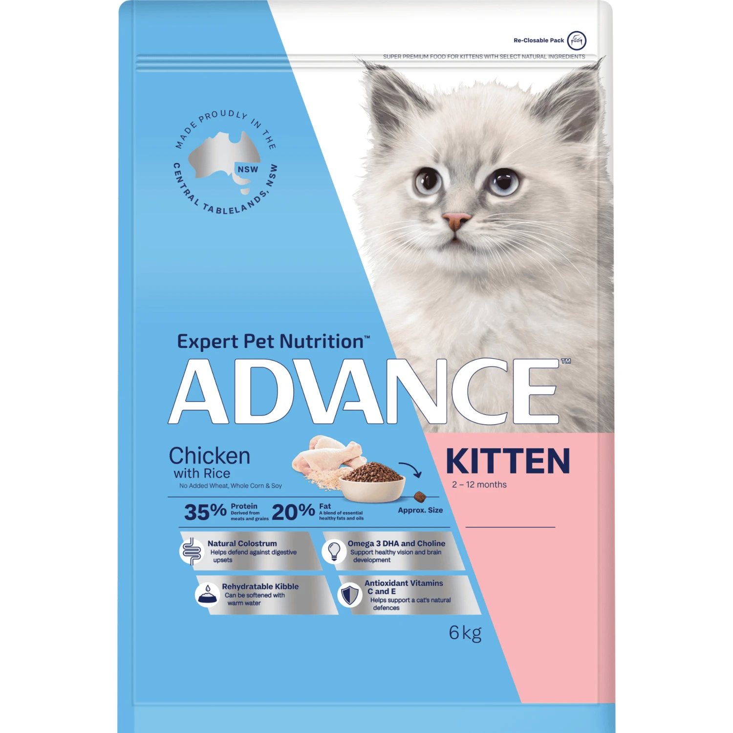 Advance Kitten Plus Growth dry and canned foods are designed to achieve optimal growth rates in kittens from weaning to 12 months of age. They provide a complete and balanced diet containing nutrients for growth and brain development. The dry food is also ideal for gestating and lactating queens.