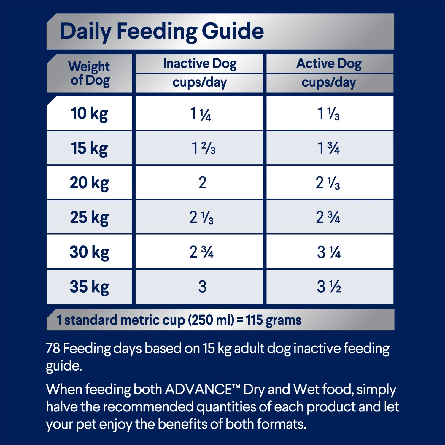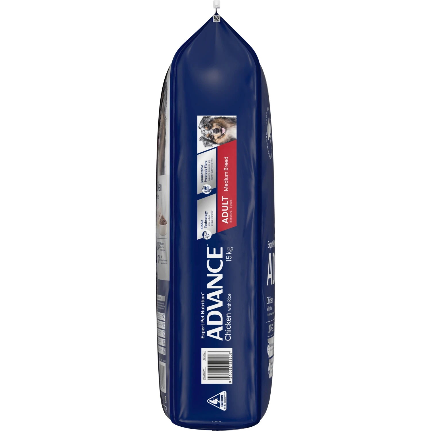 Advance Mature Dog Medium Breed dry dog food with chicken is designed for toy to medium breeds of dogs 8 years and older and large to giant breeds 5 years and older. It is formulated to meet the changing metabolism in older dogs.