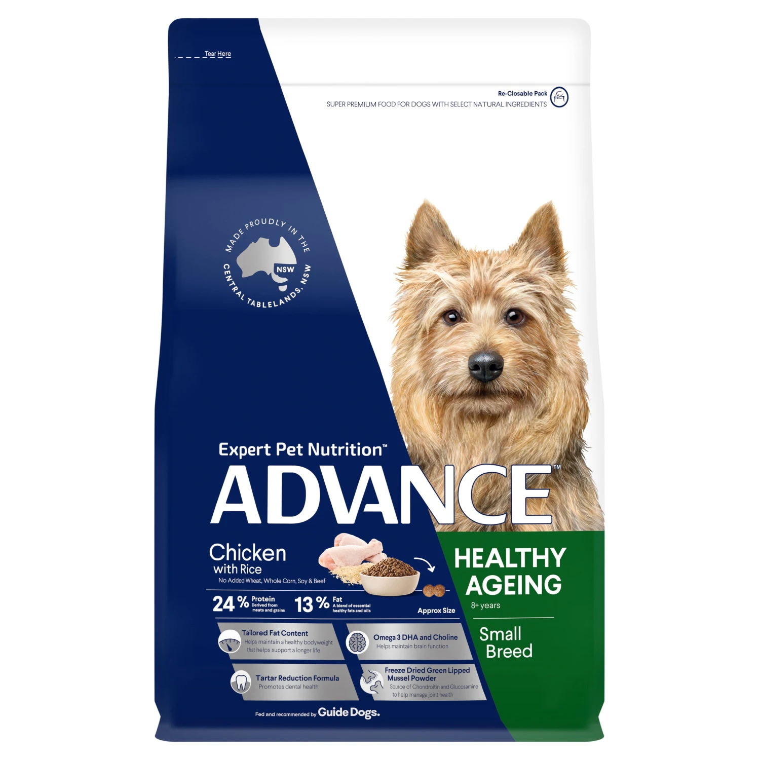 Advance Small Breed Healthy Ageing Dry Dog Food delivers optimal nutrition for Australian pets by combining global science with local expertise and select natural ingredients. Advance products are uniquely formulated for Australian pets.