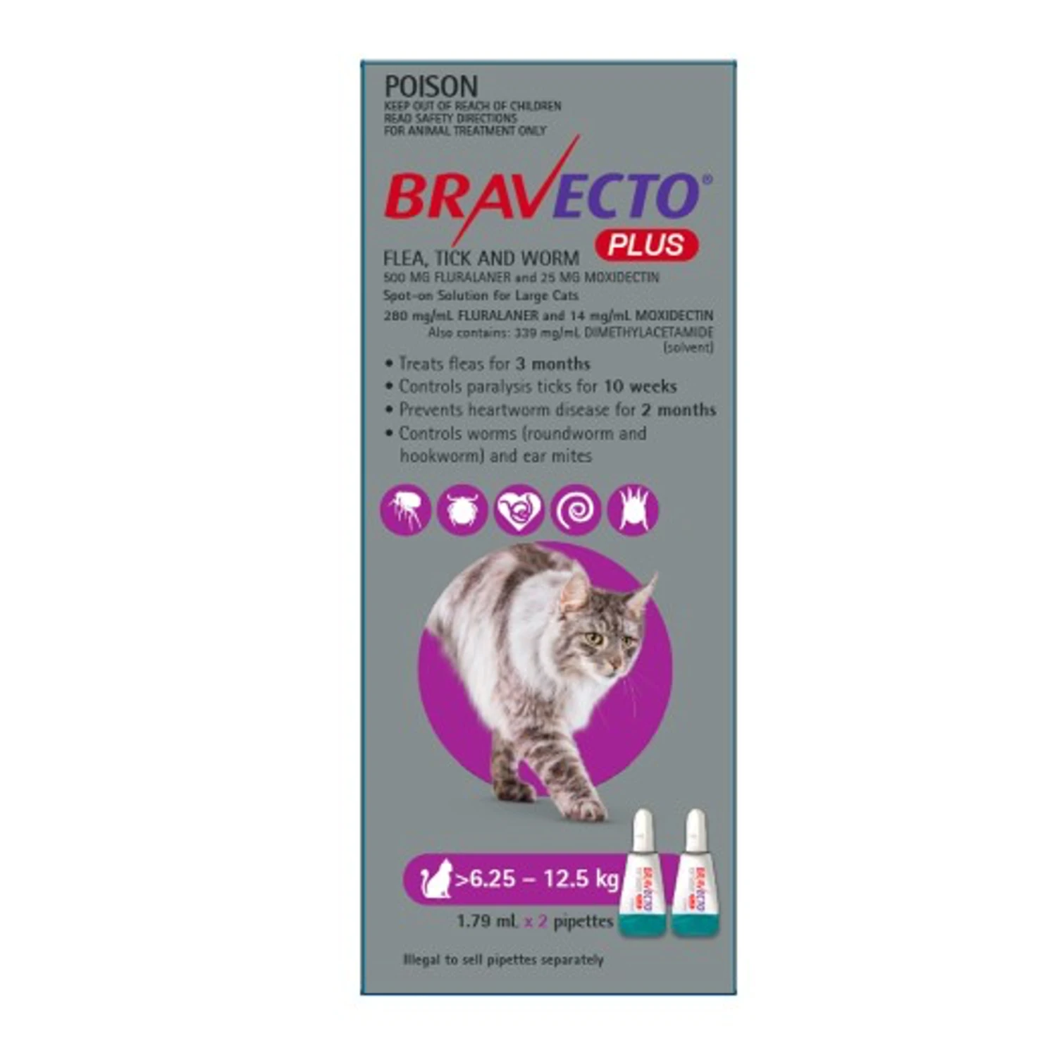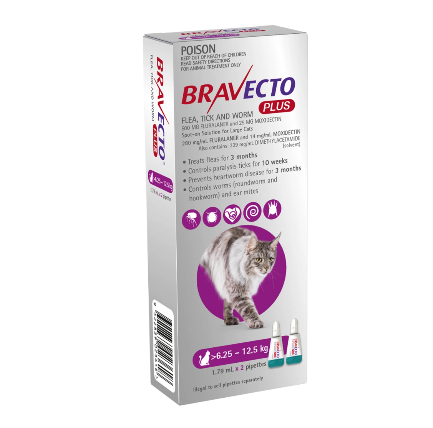 Bravecto Plus Spot-On for Cats offers protection against fleas, ticks, and heartworm for 2 months, as well as treats roundworms, and hookworms.