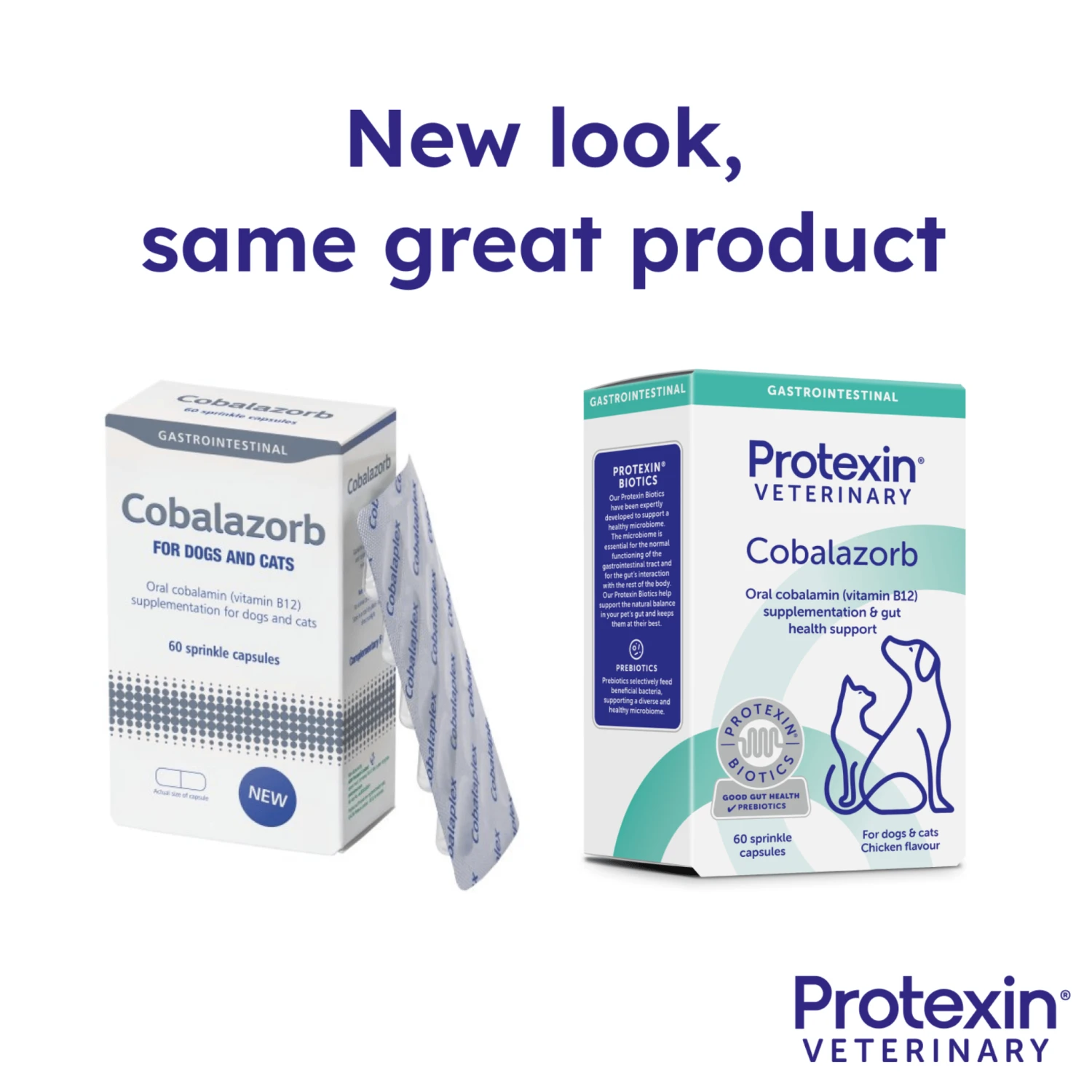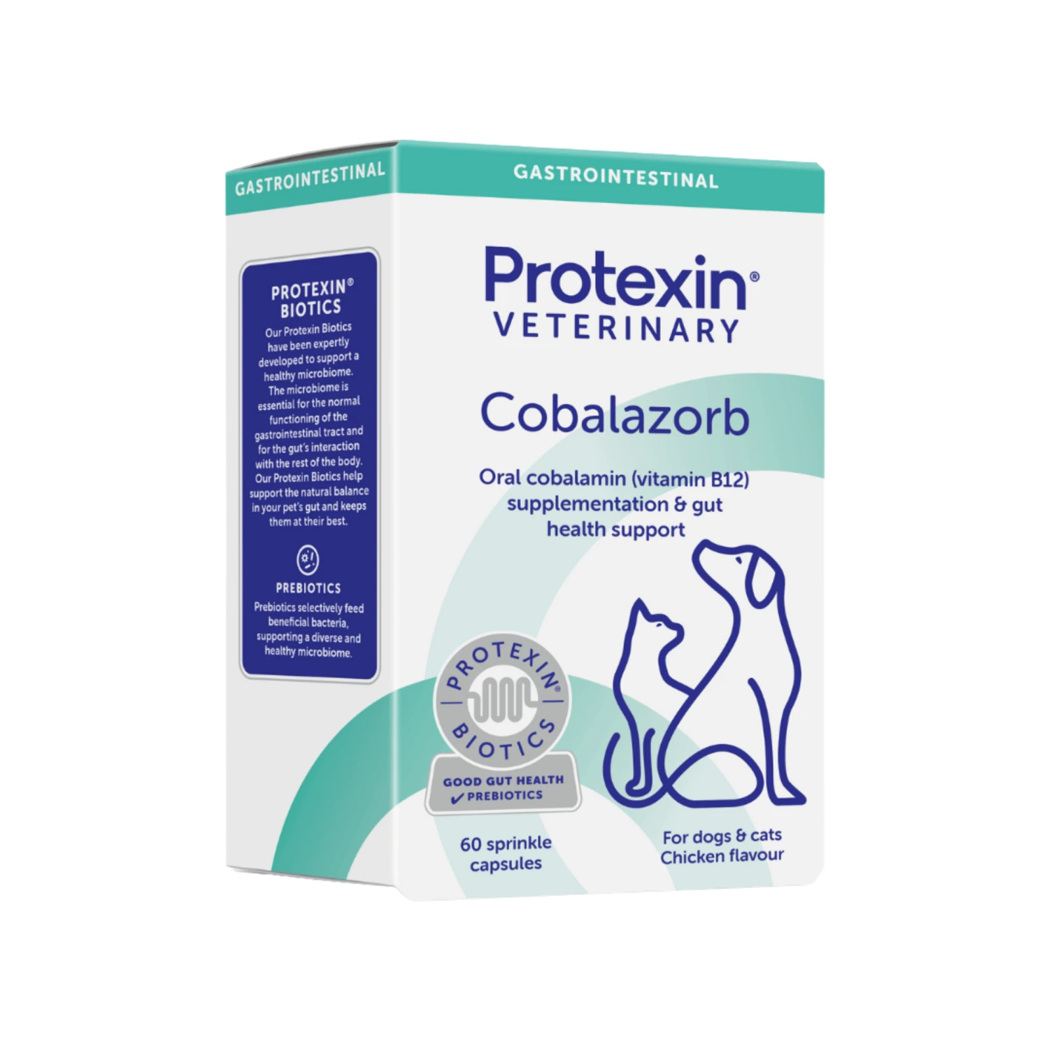 Cobalazorb for Dogs & Cats is specifically formulated to support normal serum cobalamin (vitamin B12) and folate (vitamin B9) levels in your pets. This 60-capsule pack contains cyanocobalamin, folic acid, Preplex® prebiotic, and a palatable artificial chicken flavour, making it a perfect dietary supplement for maintaining the overall health and happiness of your dogs and cats
