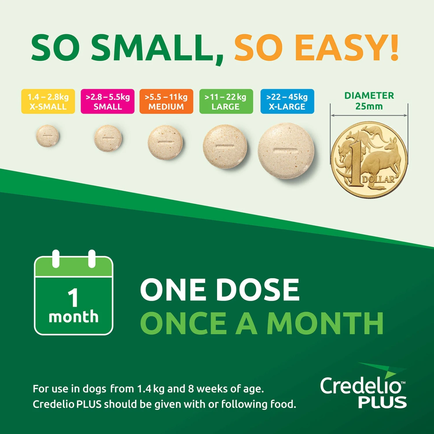 Small, tasty chewable tablet, readily accepted by dogs and puppies as young as 8 weeks