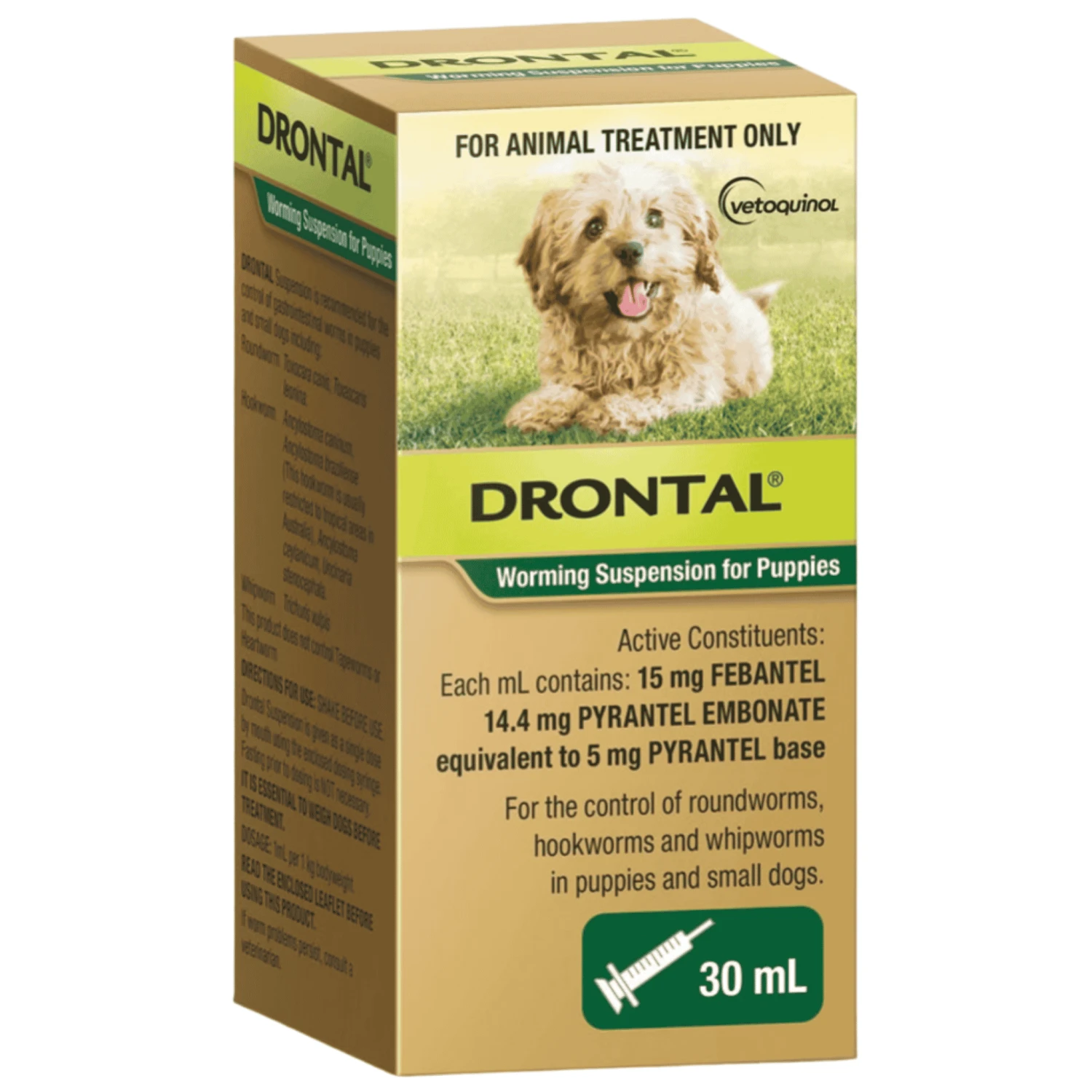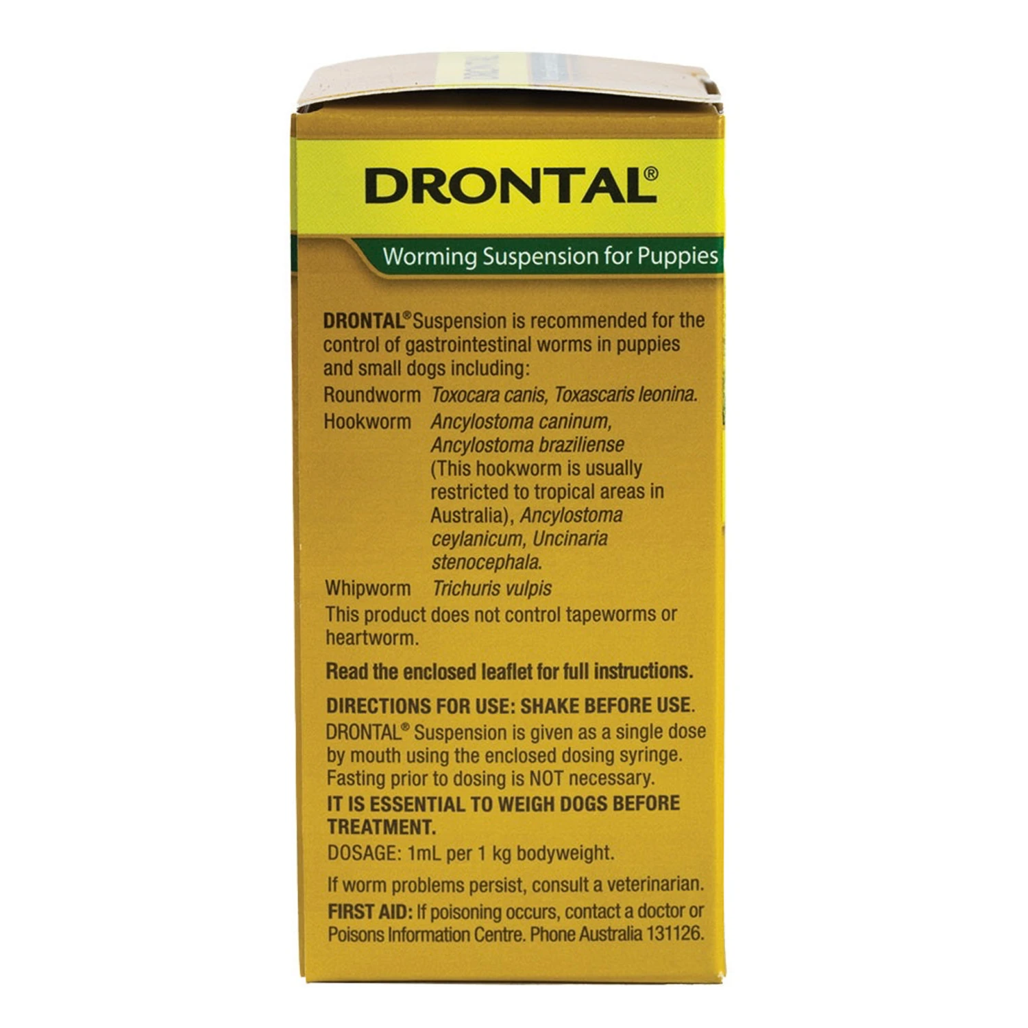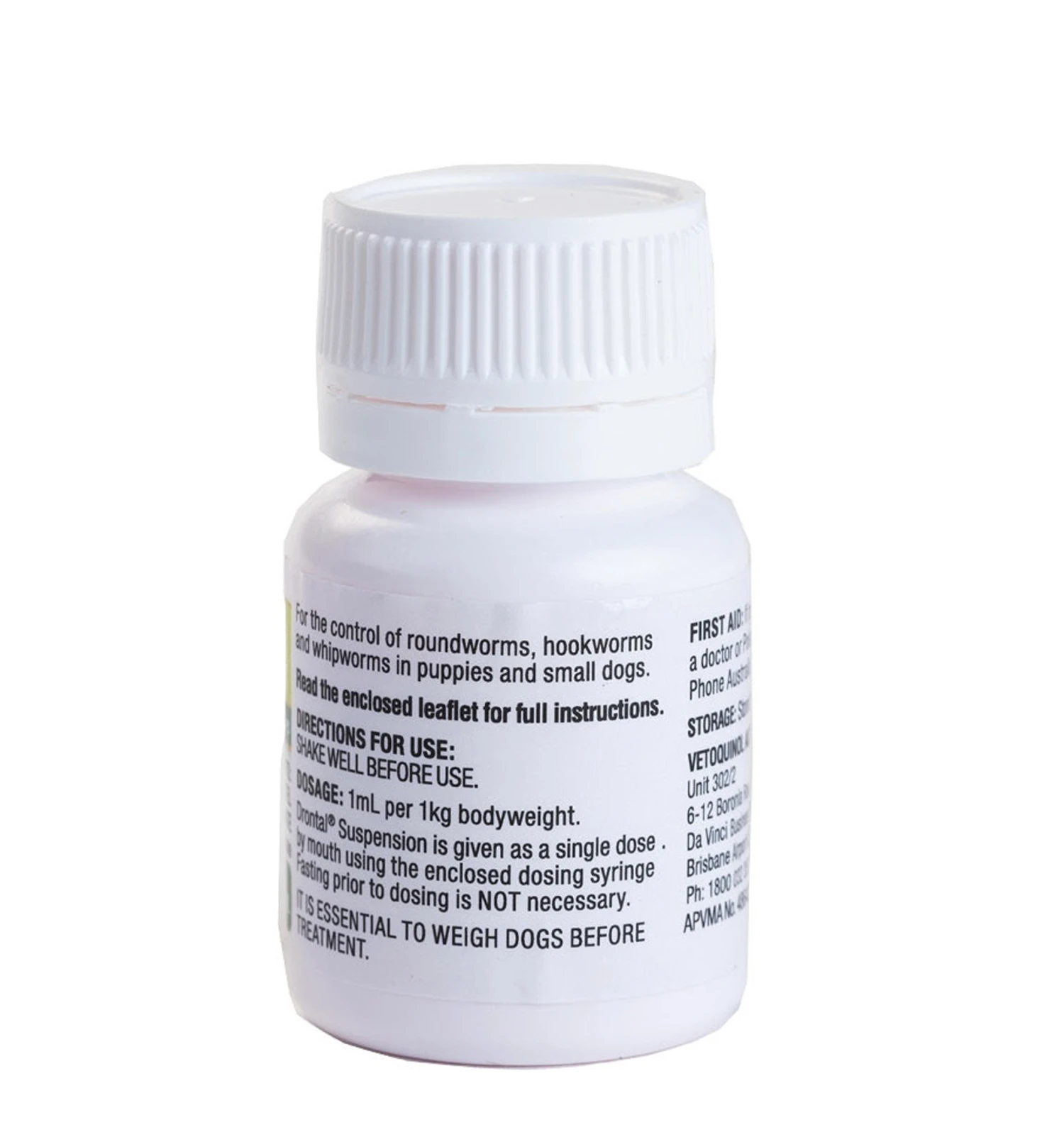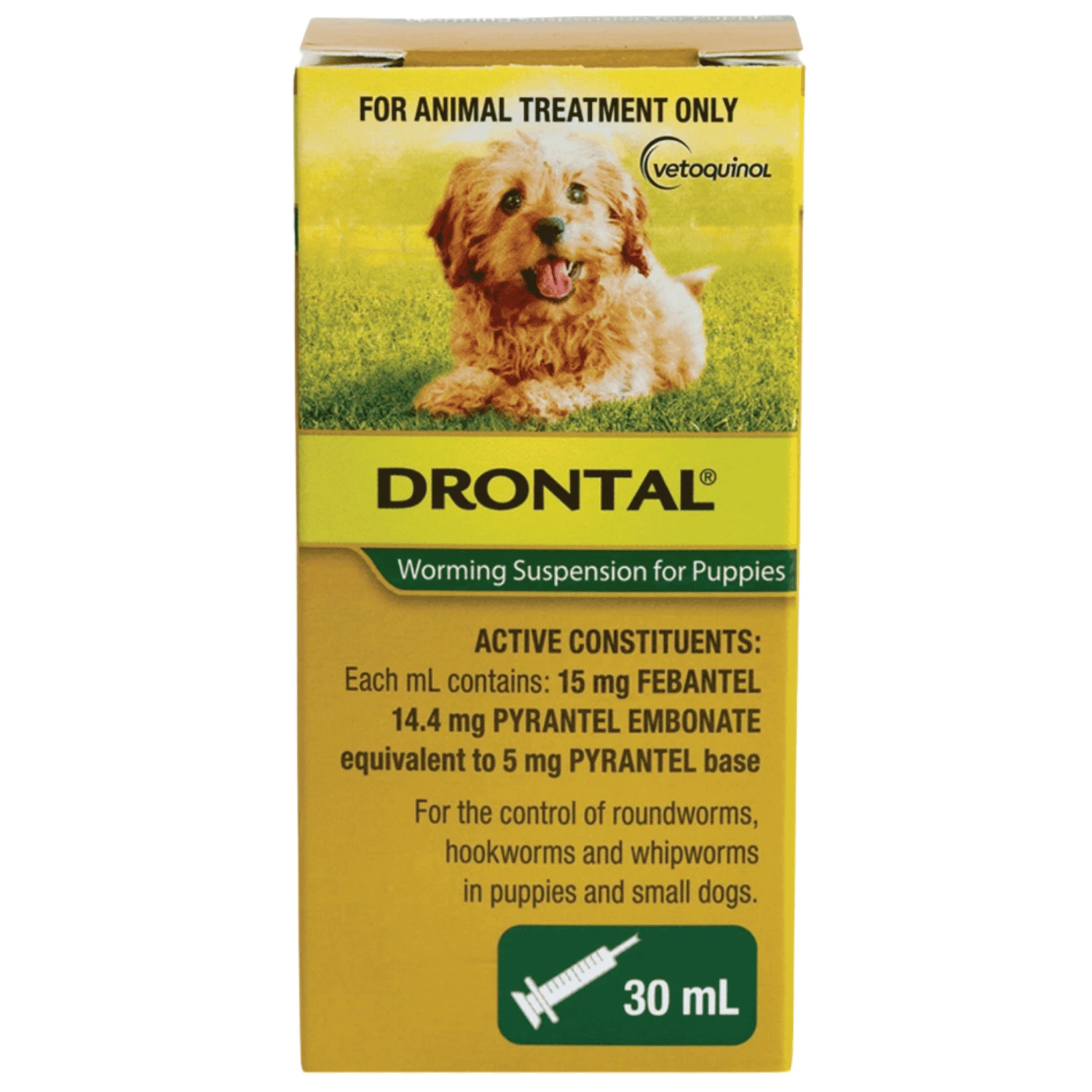 Drontal Worming Suspension is a convenient liquid wormer that makes it easy to dose a wriggly, playful puppy. It’s fast and effective and safe to use from two weeks of age, keeping even the tiniest pups safe, right from the start.