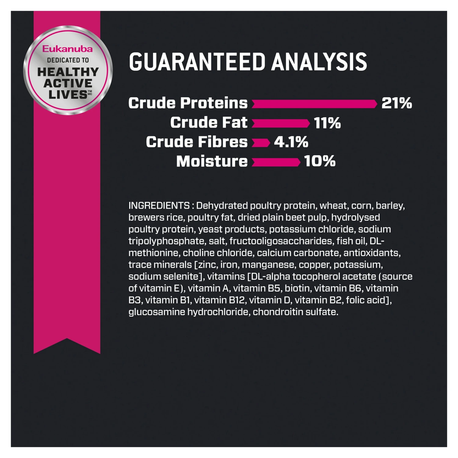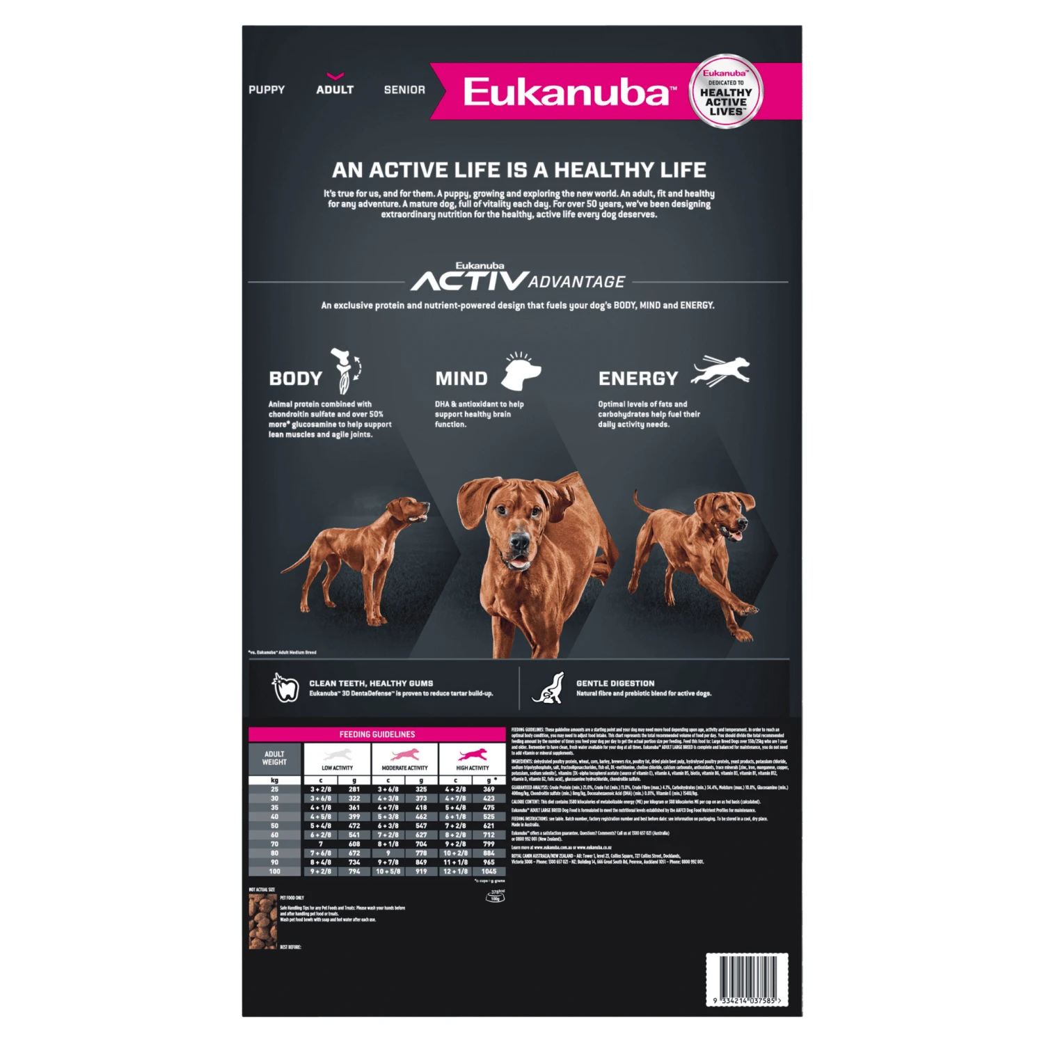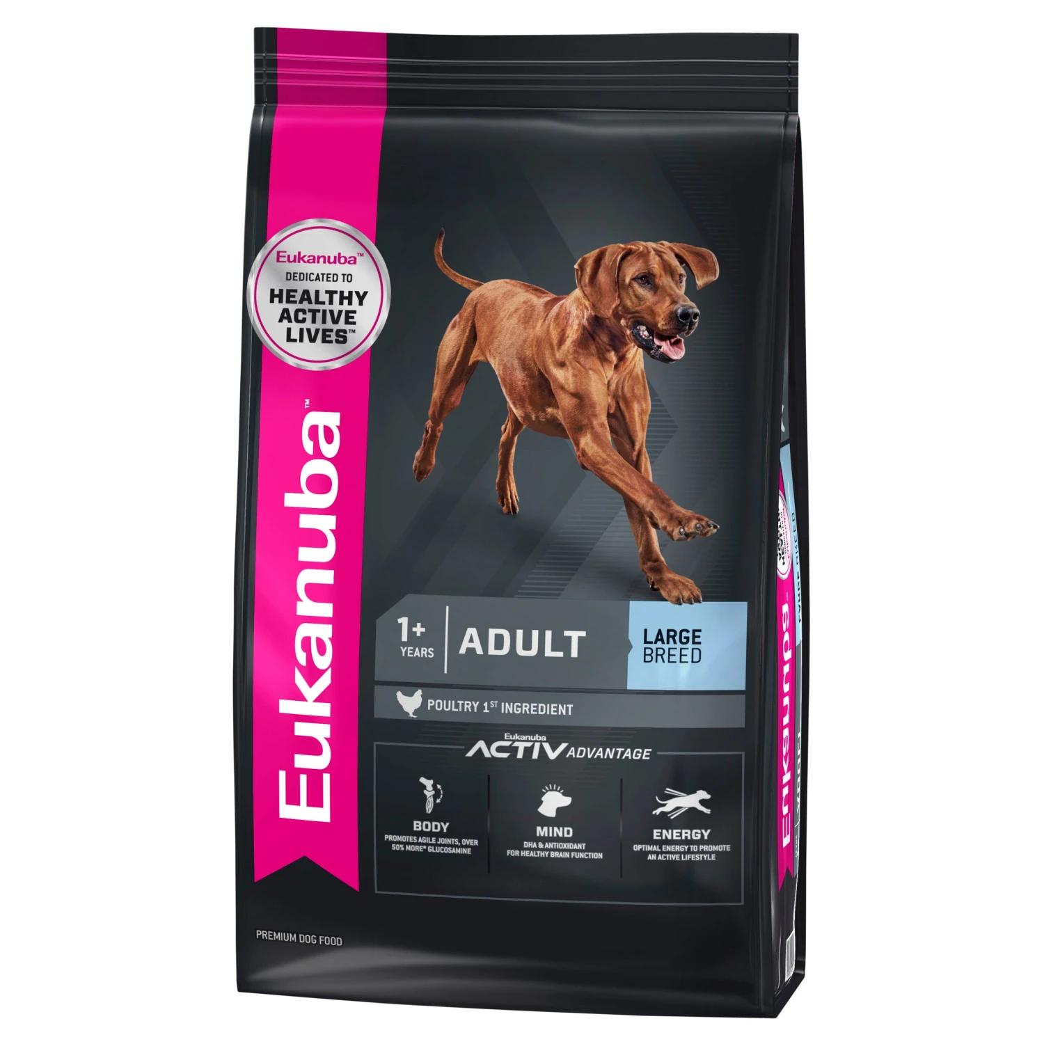 Eukanuba Adult Large Breed Formula is recommended for large and giant breed adult dogs weighing 25kg or more. It contains natural sources of Glucosamine and Chondroitin Sulfate to help support joints stressed by a large-breed dog’s greater weight and contains L-Carnitine to help your large-breed dog naturally burn fat instead of storing it. Eukanuba Large Breed Adult also has appropriate levels of a natural vegetable fibre to help aid digestion and helps your dog have appropriate stool volume for easier cleanup. Eukanuba Large Breed Adult is made in a large kibble size designed for a large-breed dog’s mouth. Real chicken is the first ingredient for great taste. Protein, fat, carbohydrates, and calories are perfectly balanced to supply your large-breed adult with the energy and nutrition required to support and enhance your dog’s life.