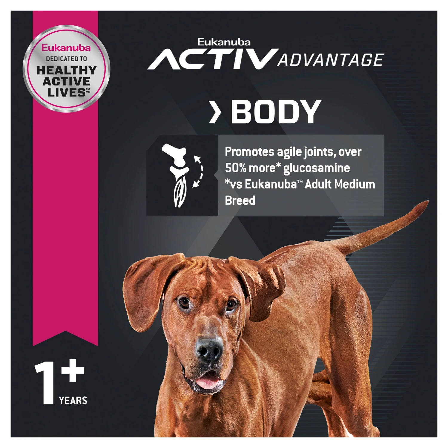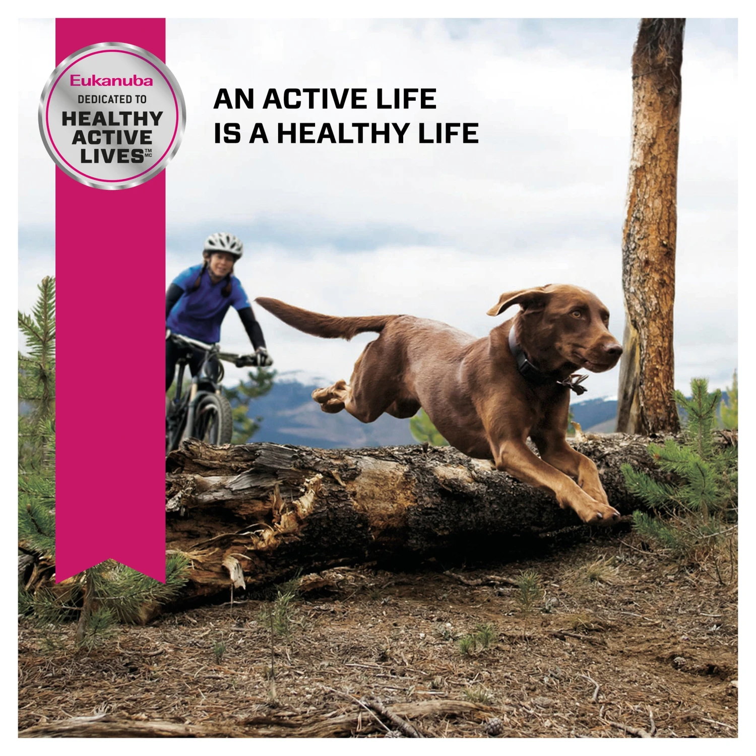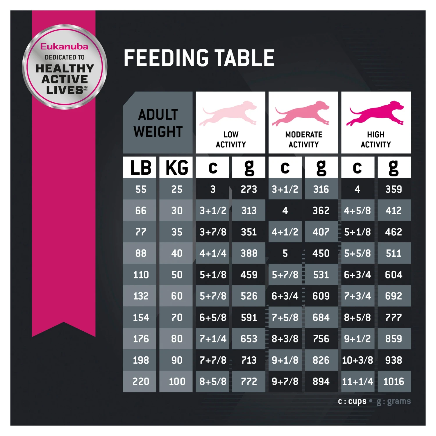 Eukanuba Adult Large Breed Formula is recommended for large and giant breed adult dogs weighing 25kg or more. It contains natural sources of Glucosamine and Chondroitin Sulfate to help support joints stressed by a large-breed dog’s greater weight and contains L-Carnitine to help your large-breed dog naturally burn fat instead of storing it. Eukanuba Large Breed Adult also has appropriate levels of a natural vegetable fibre to help aid digestion and helps your dog have appropriate stool volume for easier cleanup. Eukanuba Large Breed Adult is made in a large kibble size designed for a large-breed dog’s mouth. Real chicken is the first ingredient for great taste. Protein, fat, carbohydrates, and calories are perfectly balanced to supply your large-breed adult with the energy and nutrition required to support and enhance your dog’s life.