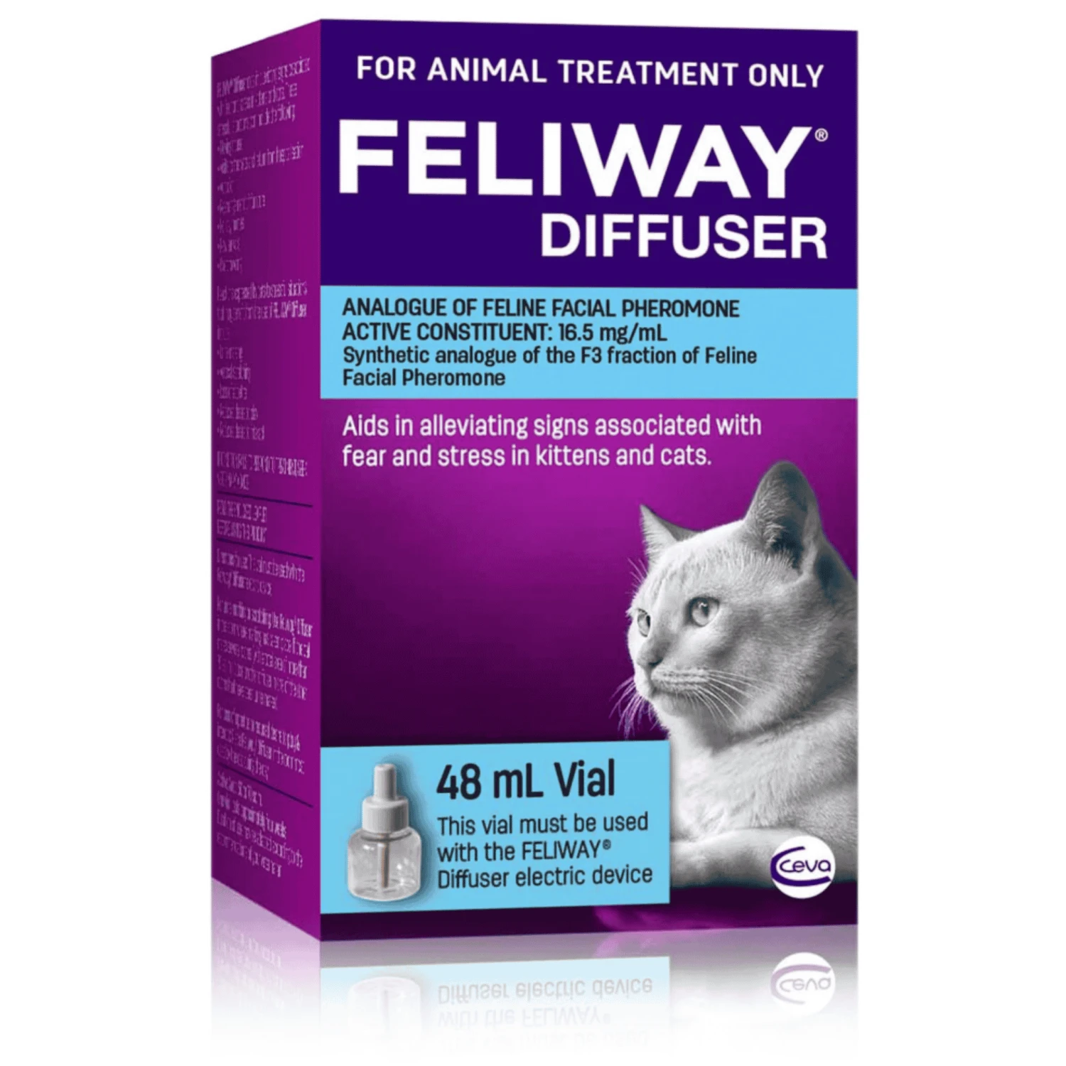 When plugged into the cat’s environment, the Feliway Diffuser disperses the calming pheromones for up to four weeks. As pheromones are species specific, Feliway is not harmful to humans or other animals. Feliway is natural, safe and simple to use. A consultation with a vet is recommended to ascertain the severity and causes for behavioural problems exhibited.