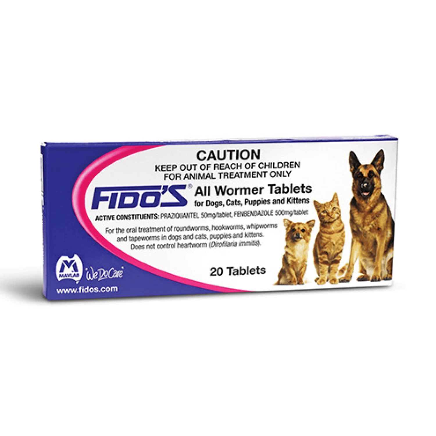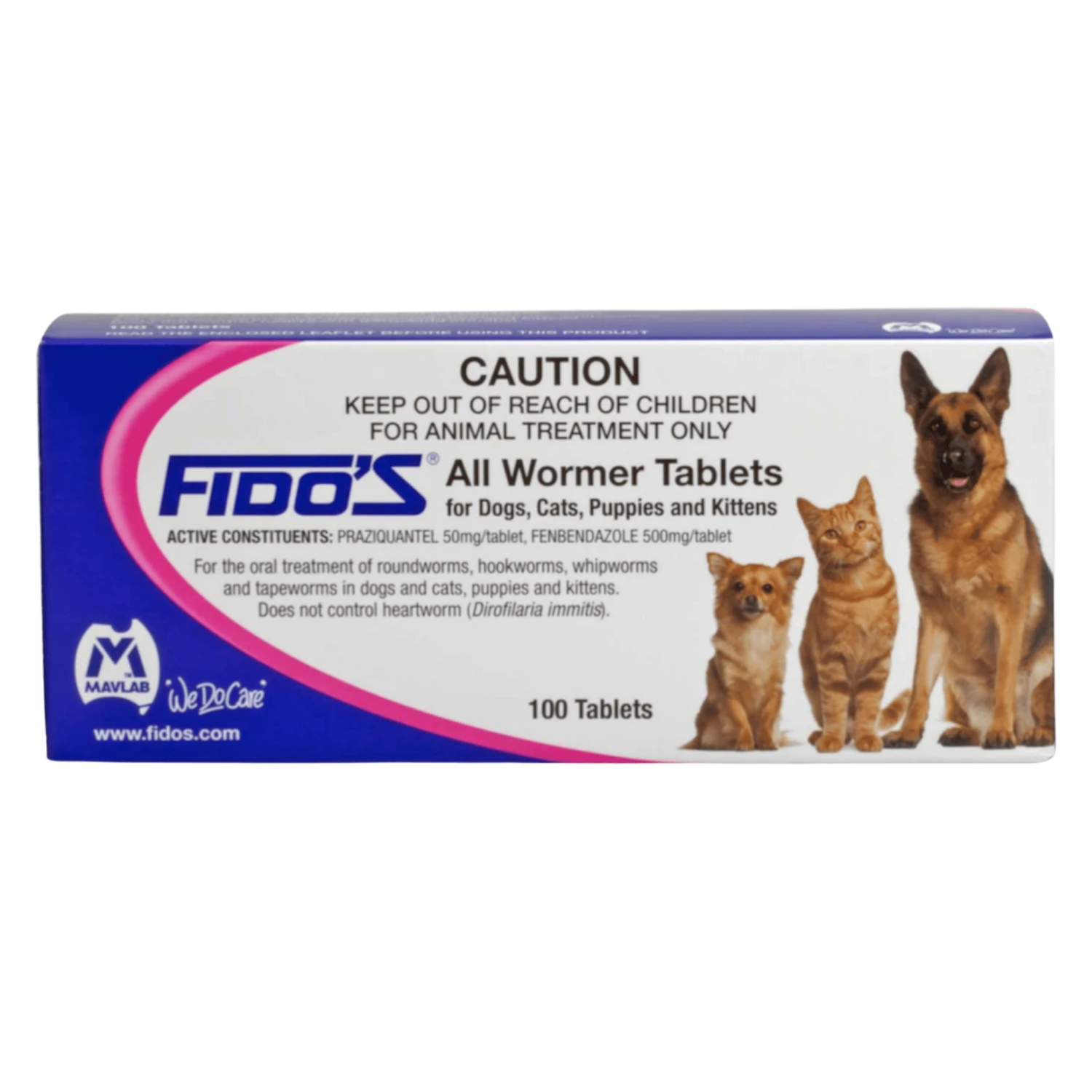 Fido’s All Wormer Tablets is used for oral treatment of roundworms, hookworms, whipworms and tapeworms (including the hydatid tapeworm) in dogs, cats, puppies and kittens. Do not control heartworm. Contains praziquantel 50mg / tablet and fendendazole 500 mg / tablet.