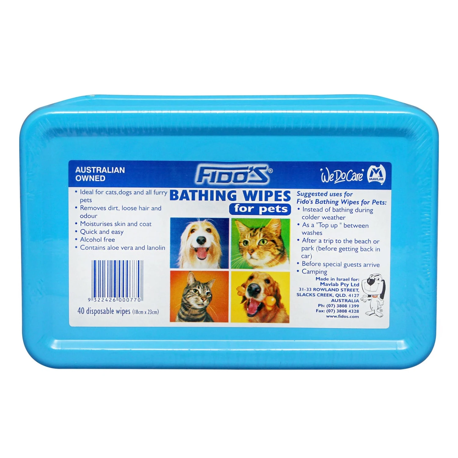 Fido’s Bathing Wipes contain aloe vera and lanolin. These alcohol free-wipes can be used instead of washing during cold weather or as a top-up between washes. Ideal for cleaning and removing loose fur and odour.