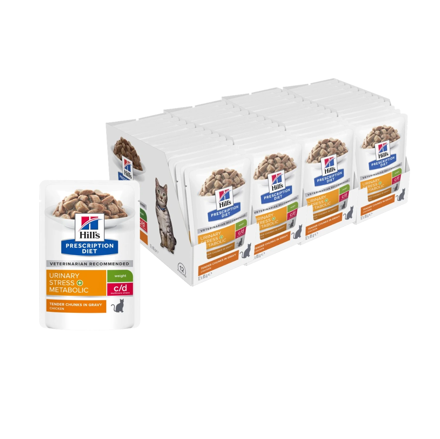 Hill’s Prescription Diet c/d Urinary Stress + Metabolic cat food is clinical nutrition specially formulated to help manage your cat’s urinary health and weight. It is a weight management cat food that has been shown to reduce the recurrence rate of the most common urinary signs by 89% and reduce body weight by 11% in 60 days. It is also a urinary health cat food that contains ingredients to help manage stress. This wet cat food is made with chicken and has a delicious taste that your cat will love.
