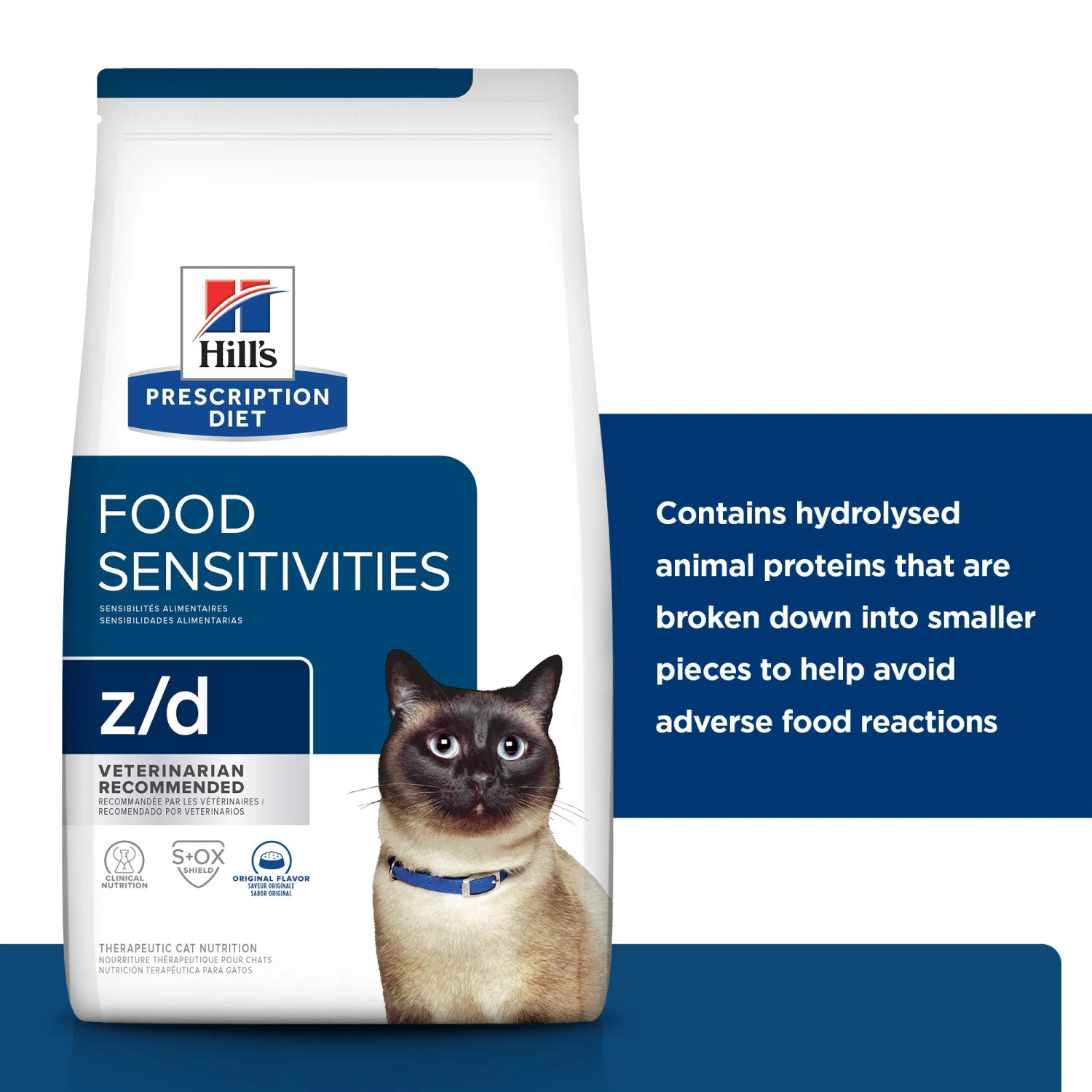 Hill’s Prescription Diet z/d is clinical nutrition specially formulated to help avoid skin and digestive signs from adverse food reactions in cats. It’s made in the USA with global ingredients you can trust, and was developed by Hill’s nutritionists and veterinarians. This food is formulated to promote an environment that makes it difficult for struvite and calcium oxalate crystals to form. It also has clinically proven antioxidants to help support a healthy immune system. Please consult your veterinarian for further information on how Prescription Diet foods can help your cat continue to enjoy a happy and active life.