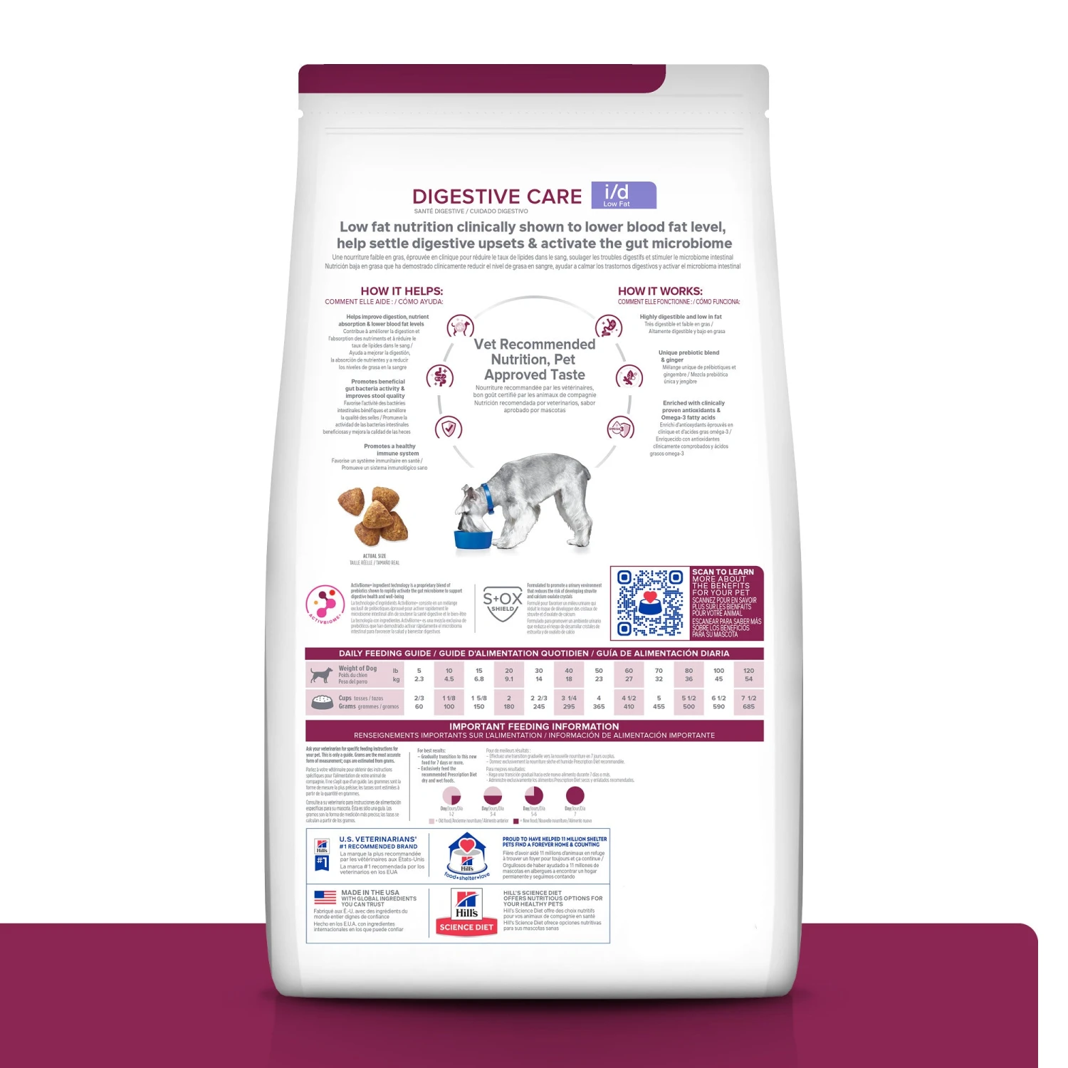 Hill’s Prescription Diet i/d Low Fat Dry Dog Food is highly digestible low fat nutrition shown to lower blood fat level to help settle digestive upsets. Fortified with Hill’s breakthrough ActivBiome+ ingredient technology, a unique blend of prebiotic fibres, clinically shown to rapidly activate the gut microbiome to support digestive health and well-being. It also includes omega-3 & 6 fatty acids and ginger. Plus, it has clinically proven antioxidants to help support a healthy immune system, and is formulated to promote an environment that makes it difficult for struvite and calcium oxalate crystals to form. It’s made in the USA with global ingredients you can trust, and was developed by Hill’s nutritionists and veterinarians.