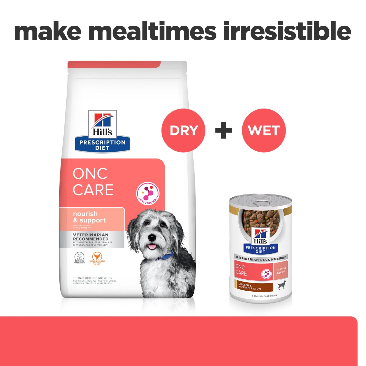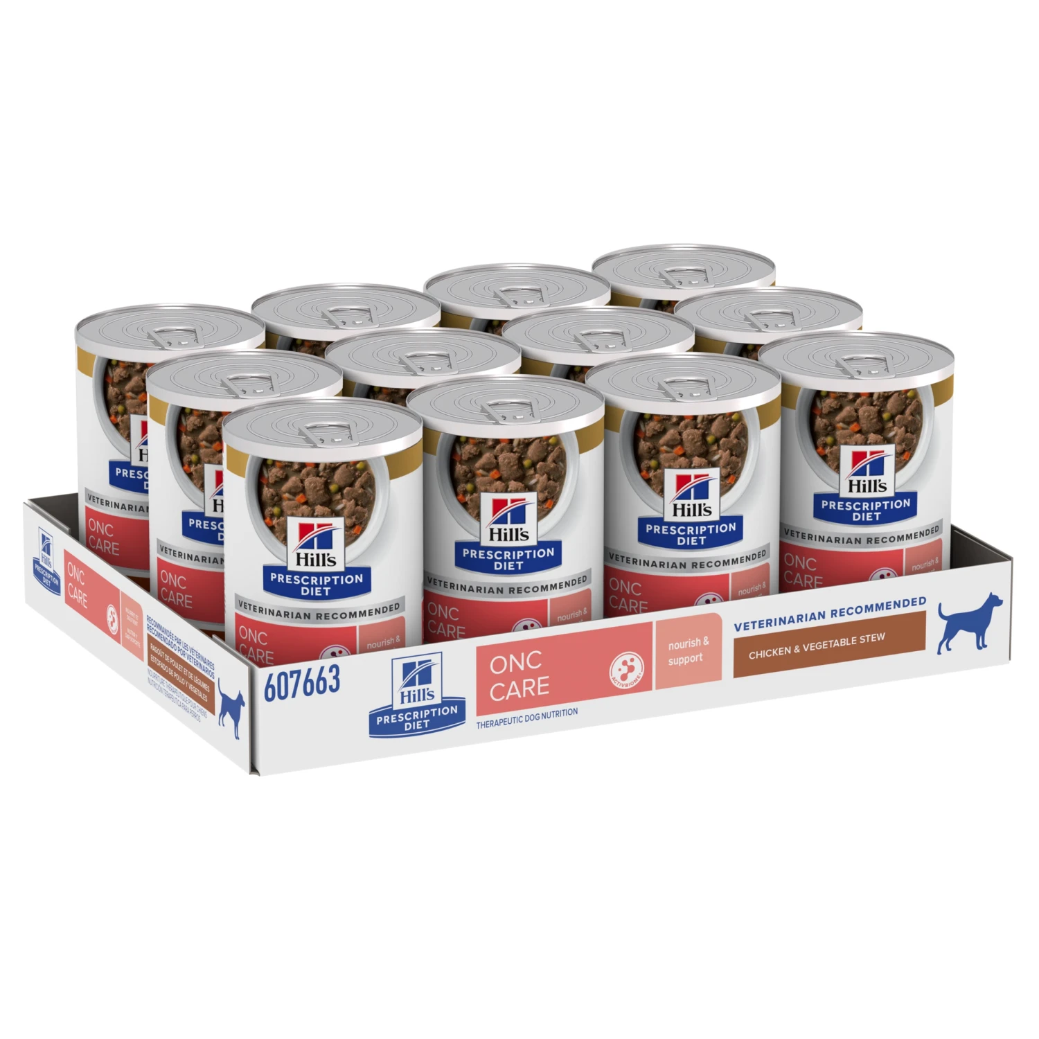 - Hill’s Prescription Diet ONC Care Chicken & Vegetable Stew Dog Food is a veterinary diet specially formulated by Hill’s nutritionists and veterinarians to help pets fighting serious illness such as cancer