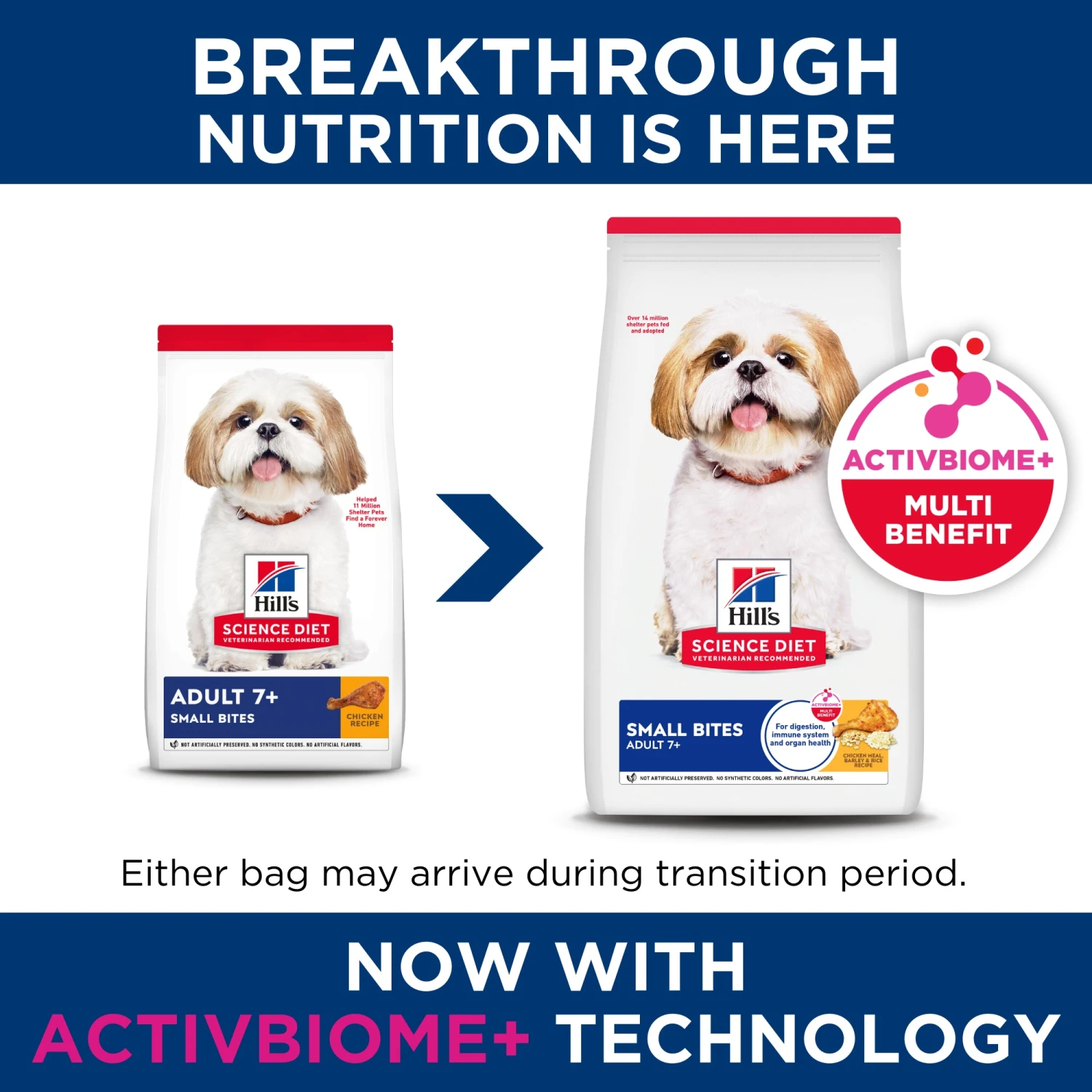 As little or toy-breed dogs get older, their nutrition needs change. Hill’s Science Diet Adult 7+ Small Bites dry dog food is formulated for the specific aging needs of small dogs aged 7 and older.