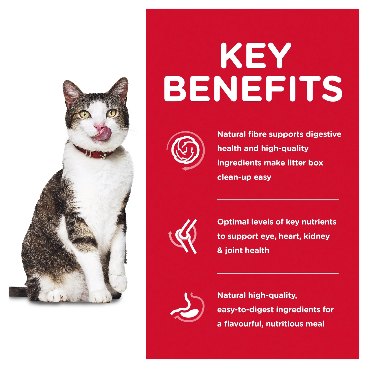 - Dry cat food with natural fibres to promote improved digestion and litter box cleaning for your older cat