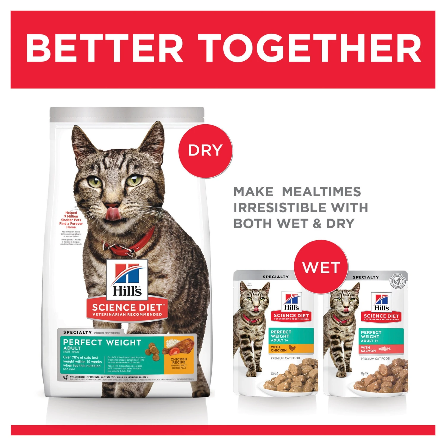 Science Diet Feline Adult Perfect Weight cat food provides breakthrough nutrition formulated to help your cat achieve a healthy weight and improve quality of life. It is ideal for multi-cat households with cats of different breeds and weights, helping heavier cats reach a healthy weight while providing balanced nutrition to leaner cats. Recommended for adult cats that are less active, neutered or otherwise prone to excess weight gain. Dry and canned formulas available.