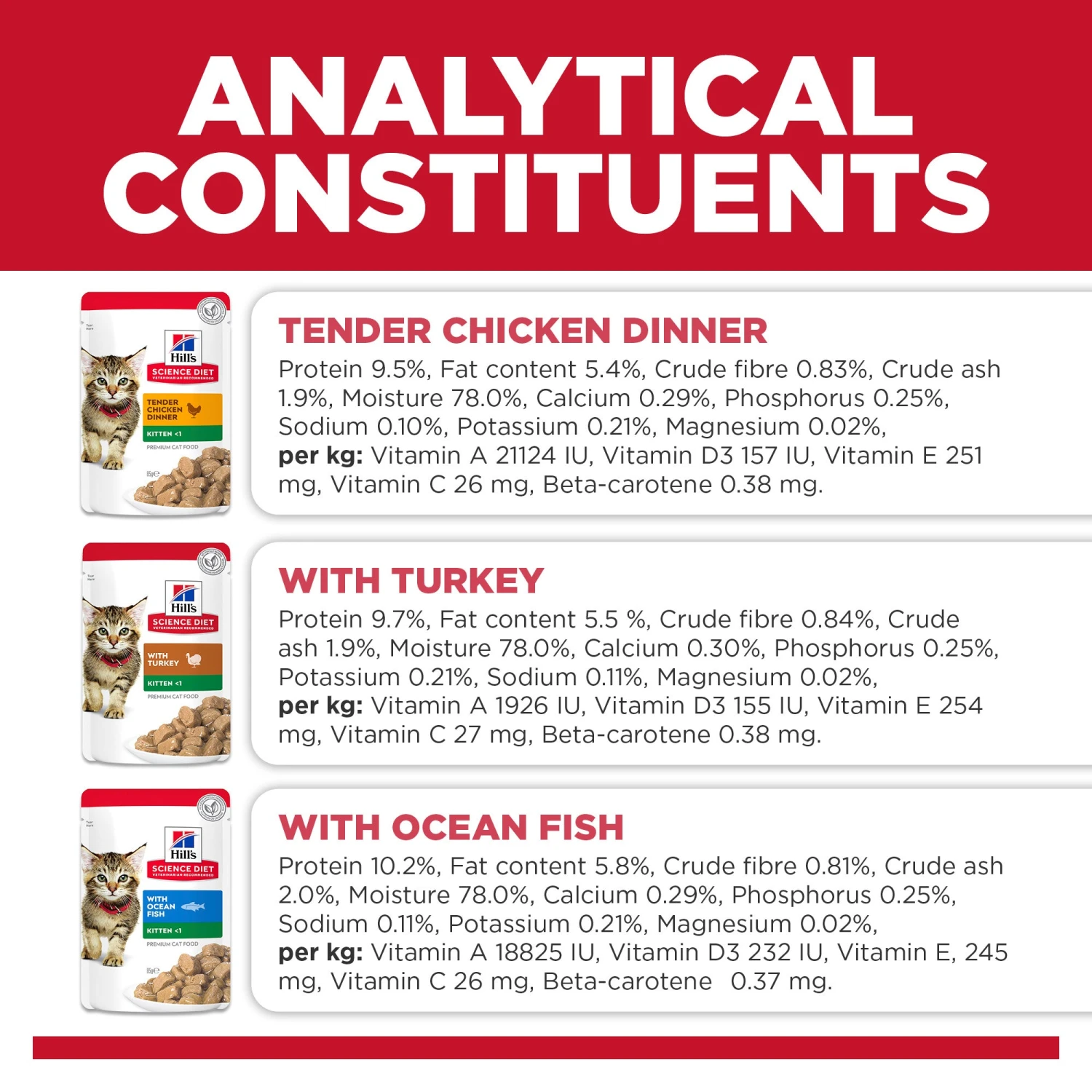 Delicious meat chunks in gravy with omega-3 fatty acids for eye health and brain development in kittens, and high-quality protein to support muscle growth. Balanced levels of minerals for strong bones and teeth.