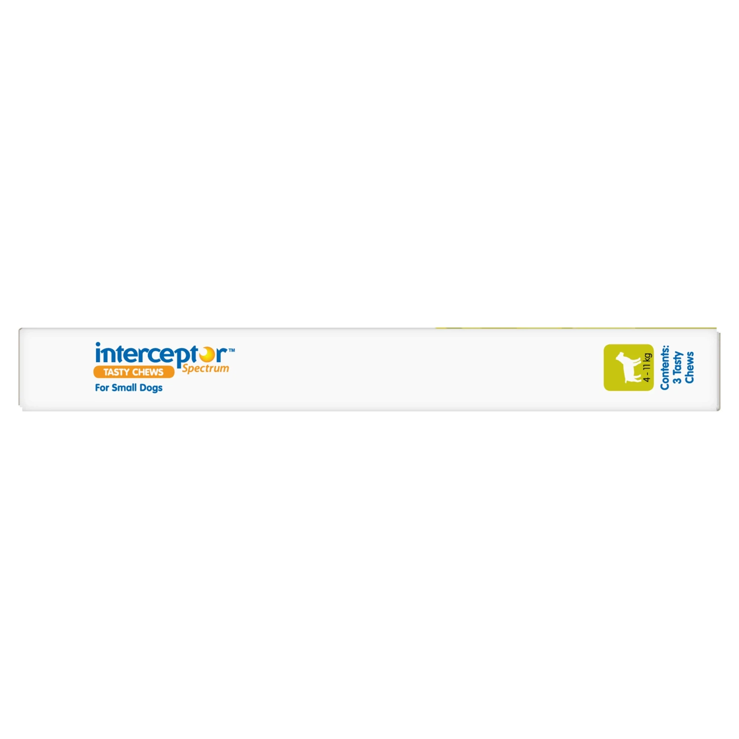 Interceptor Spectrum Chews for Dogs are used monthly for the prevention of heartworm (Dirofilaria immitis) infection, control of adult roundworm (Toxocara canis, Toxascaris leonina), immature roundworm (Toxocara canis), adult whipworm (Trichuris vulpis), adult hookworm (Ancylostoma caninum), adult tapeworm (Echinococcus granulosus, Taenia pisiformis and Dipylidium caninum) and aid in the control of adult hookworm (Uncinaria stenocephala) infection in dogs.