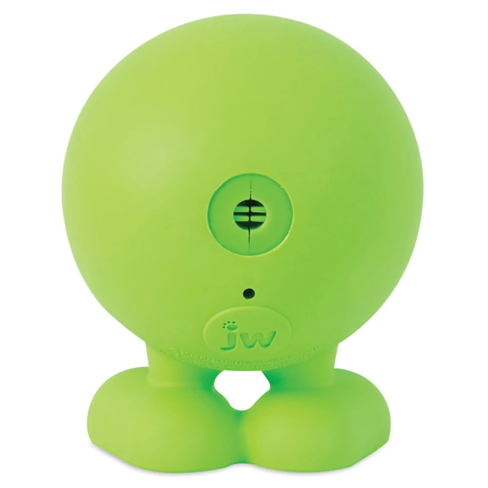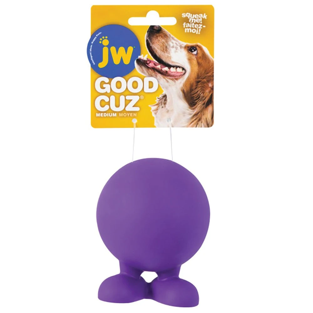 The Good Cuz is a hard rubber squeaky dog toy ball with legs. Assorted colours only.