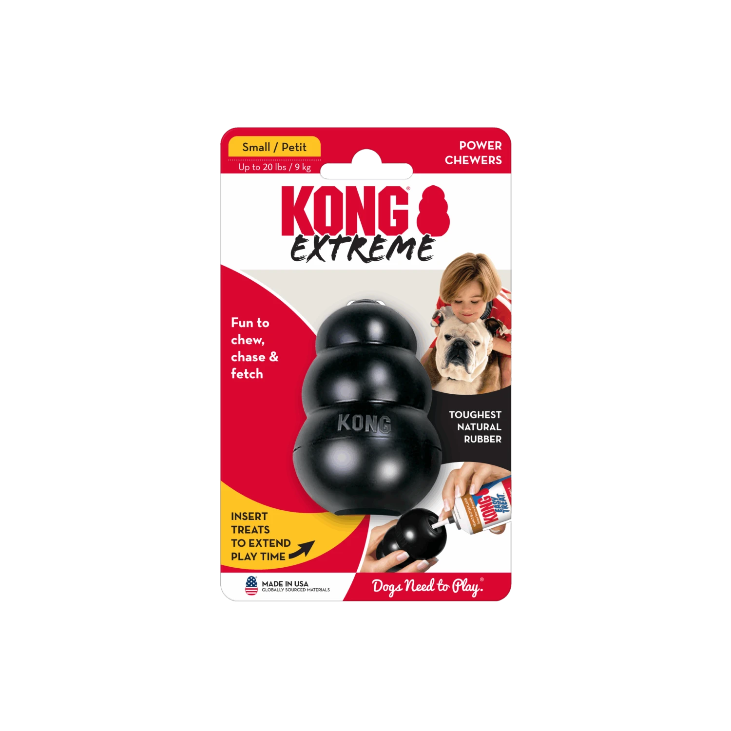 KONG Extreme represents the most durable version of the original KONG toy. The ultra-strong, ultra-durable, black rubber compound is recommended for the most powerful chewers.