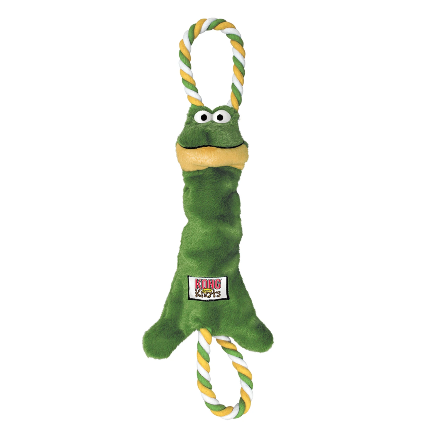 The Kong Tugger Knots Frog is a tough, interactive tug and shake toys that dogs love. Each toy has knotted ropes inside for a realistic feel, which extend outside the toy creating tug handles at both ends. This unique design creates a captivating variety of textures and resistance that dogs love – and it contains a squeaker for added fun.