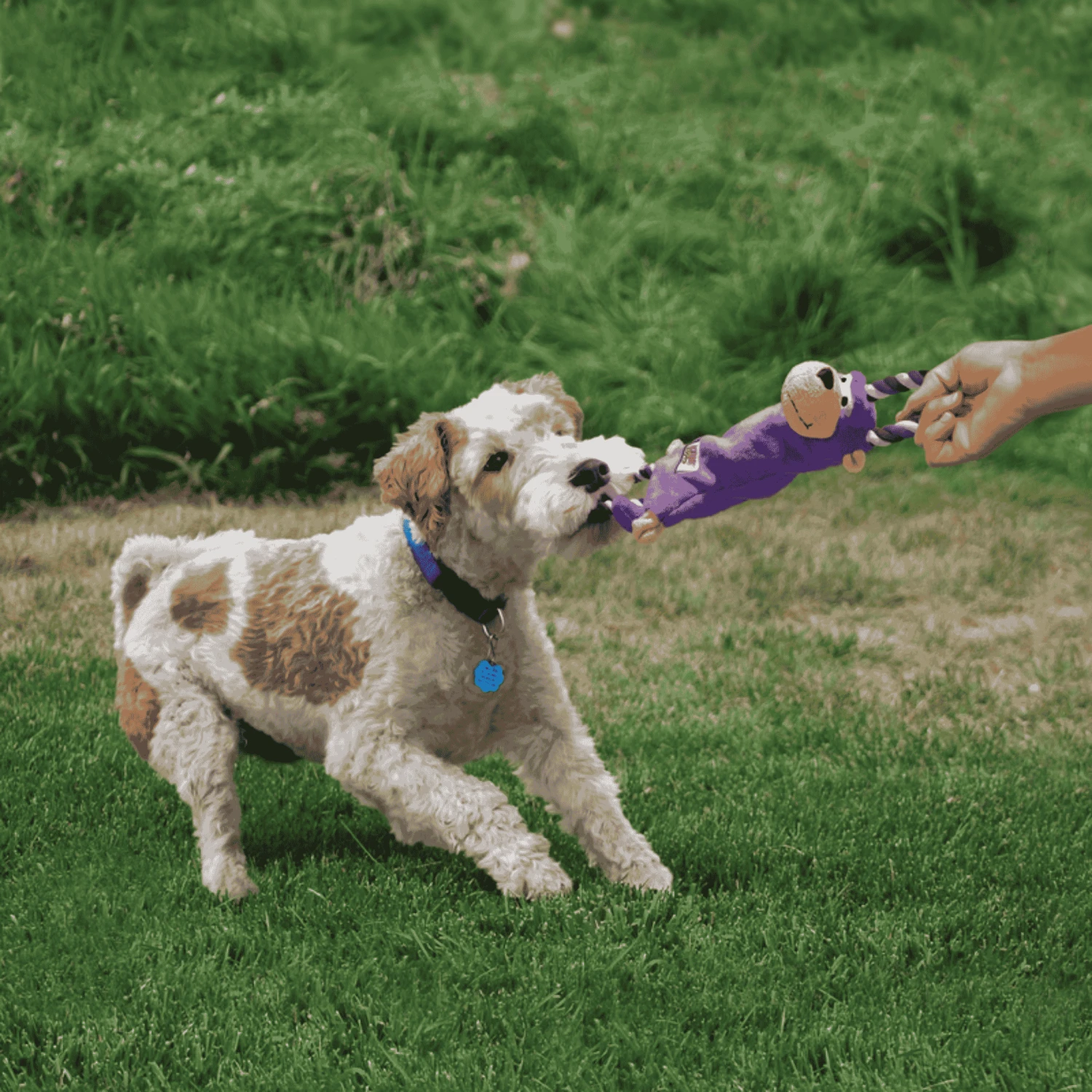 - Interactive tug and fetch toy with internal rope for natural chewing needs