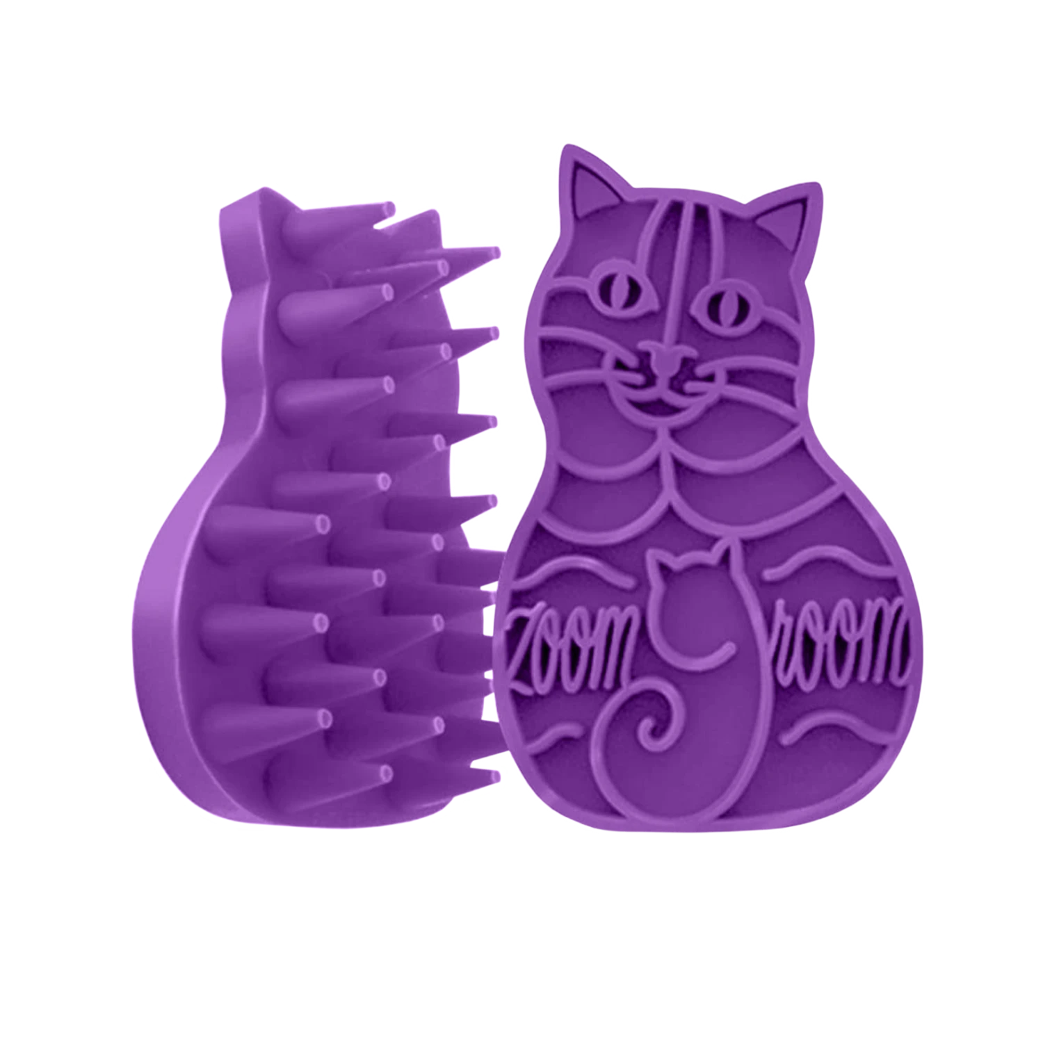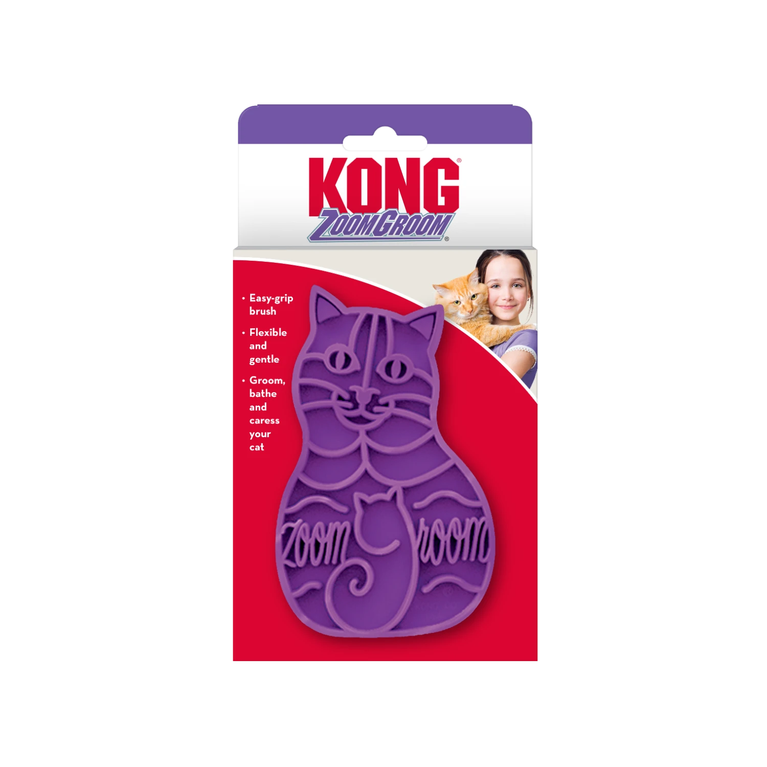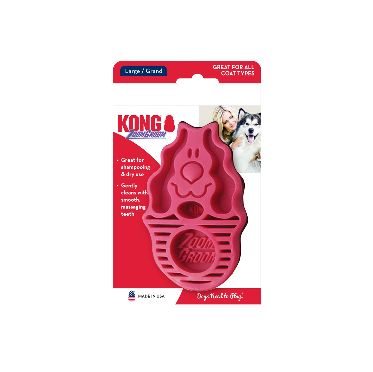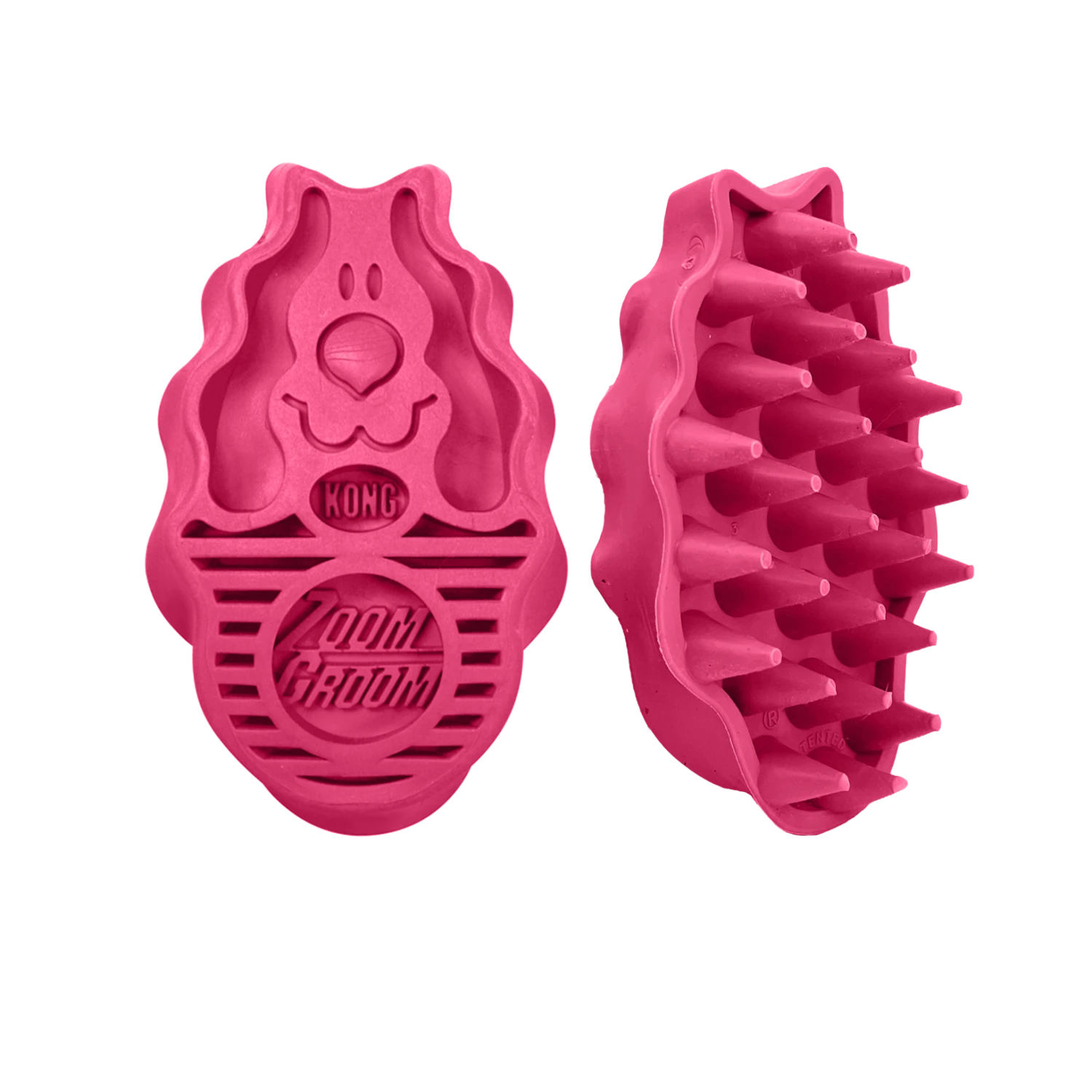 Kong Zoom Grooms have gentle rubber fingers that reach through your pet’s fur to make friendly contact with the skin without yanking or pulling. This groomassage action removes loose hair like a magnet, stimulates capillaries and natural oil production for healthy skin and coats. Empties easily with a flick. Great as a shampooing brush. Suitable for all dogs and cats.