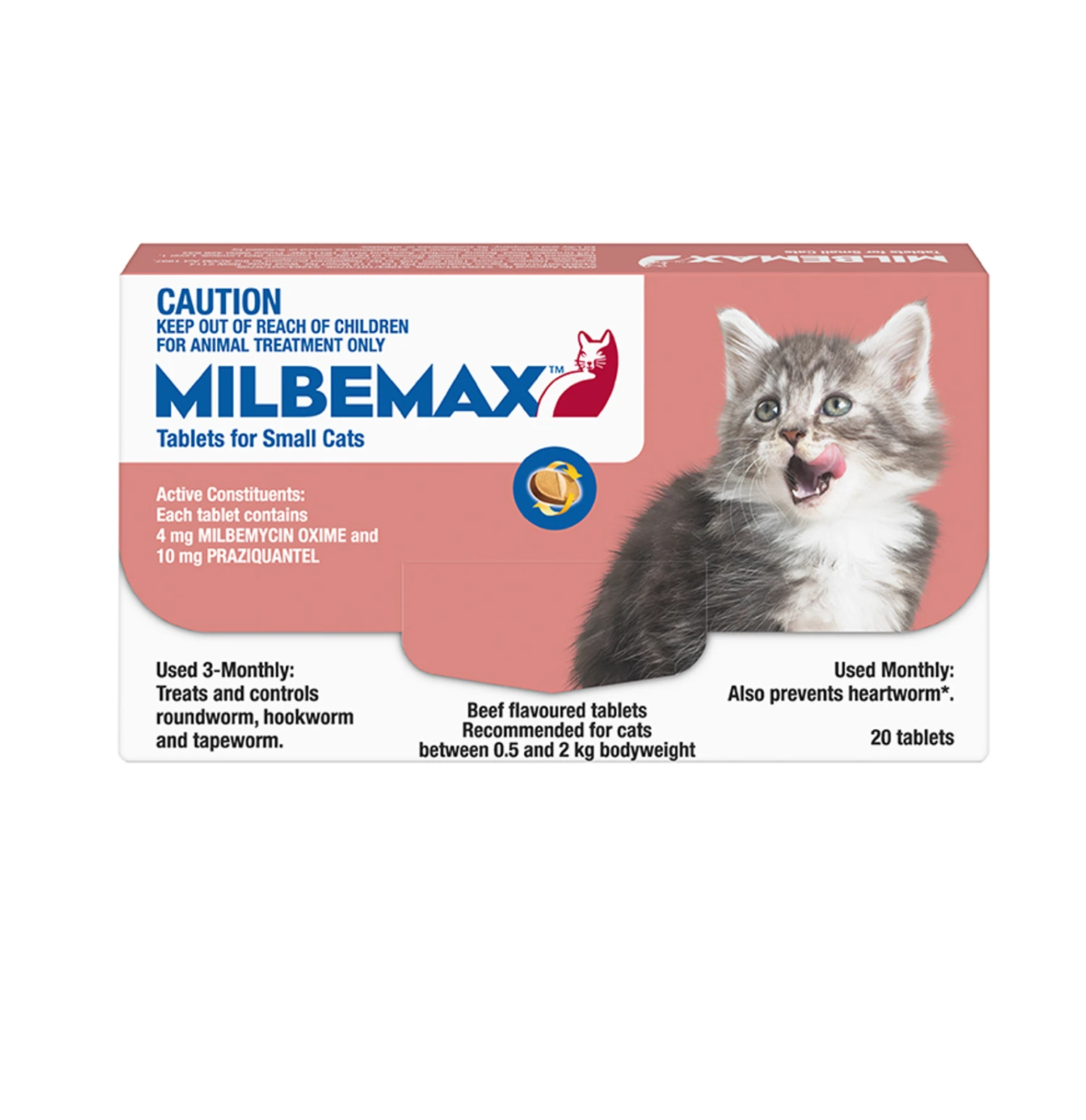 Milbemax Cat Worming Tablets are for the treatment and control of adult and immature roundworm (Toxocara cati, Toxascaris leonina),adult and immature hookworm (Ancylostoma tubaeforme) and tapeworm (Dipylidium caninum, Taenia sp.) and prevention of heartworm (Dirofilaria immitis) in cats over 6 weeks of age and 500g in bodyweight.