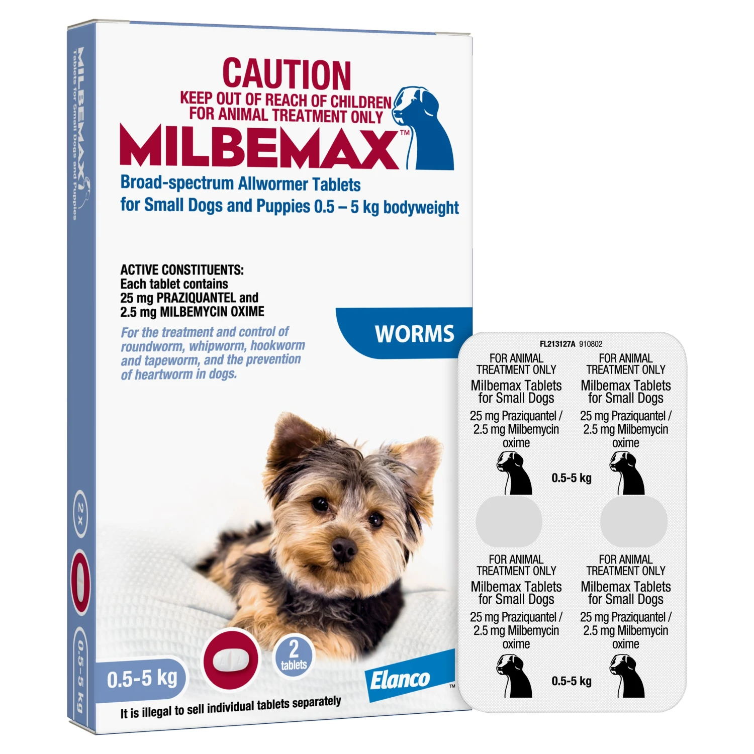 Milbemax Tablets for Dogs should only be given to dogs over 5 kg. For puppies use Milbemax Tablets for Small Dogs. Treat puppies at 2, 4, 8 and 12 weeks of age, then every three months. Lactating bitches should be treated at the same time as their puppies. Adult dogs should be treated every three months.