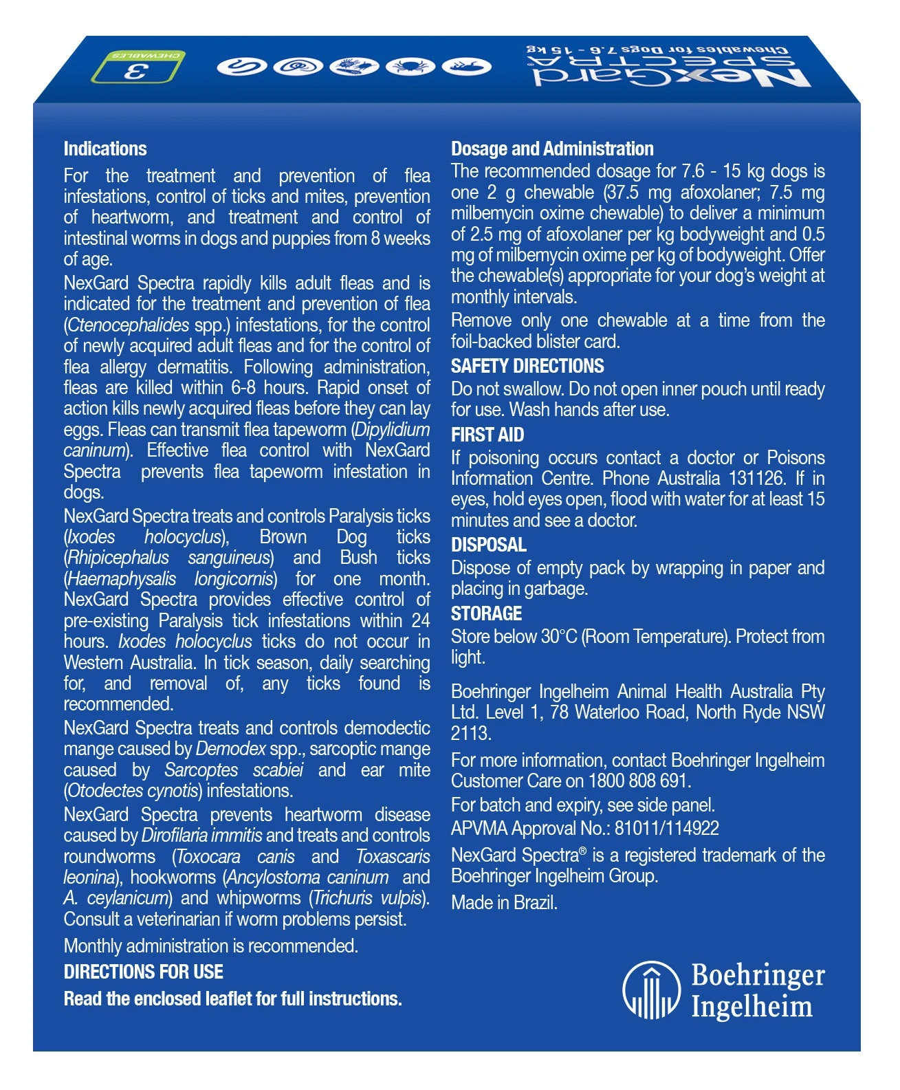 NexGard Spectra (Green) is suitable for medium dogs from 7.6 – 15 kg in bodyweight.
