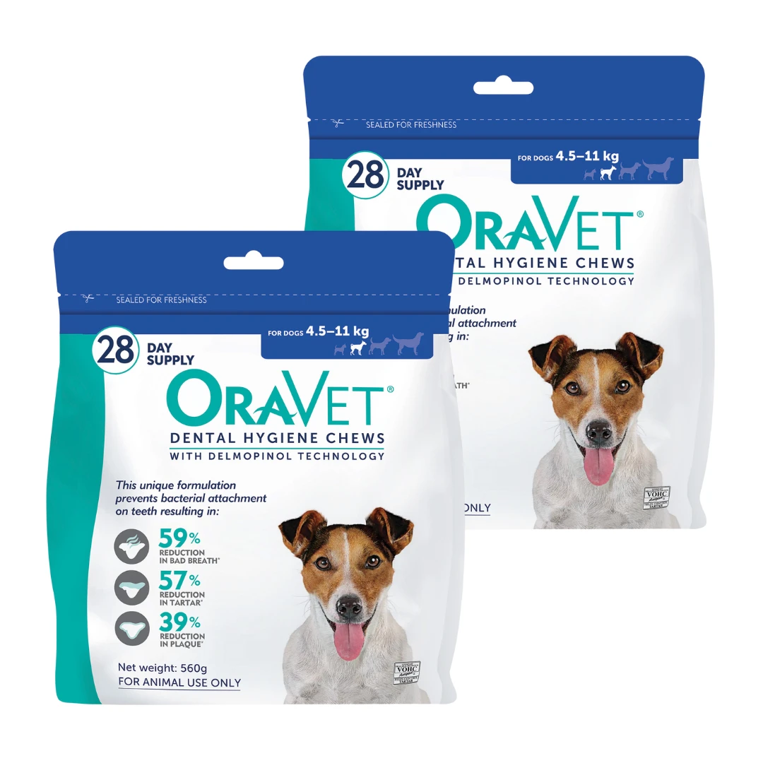 Dual-action ORAVET dental chews are the simple solution for your dog’s at-home, daily dental care. As your dog chews, that chewing action scrubs away at existing plaque. At the same time the unique ingredient, delmopinol, spreads throughout their mouth to create a protective barrier and help prevent bacterial attachment.