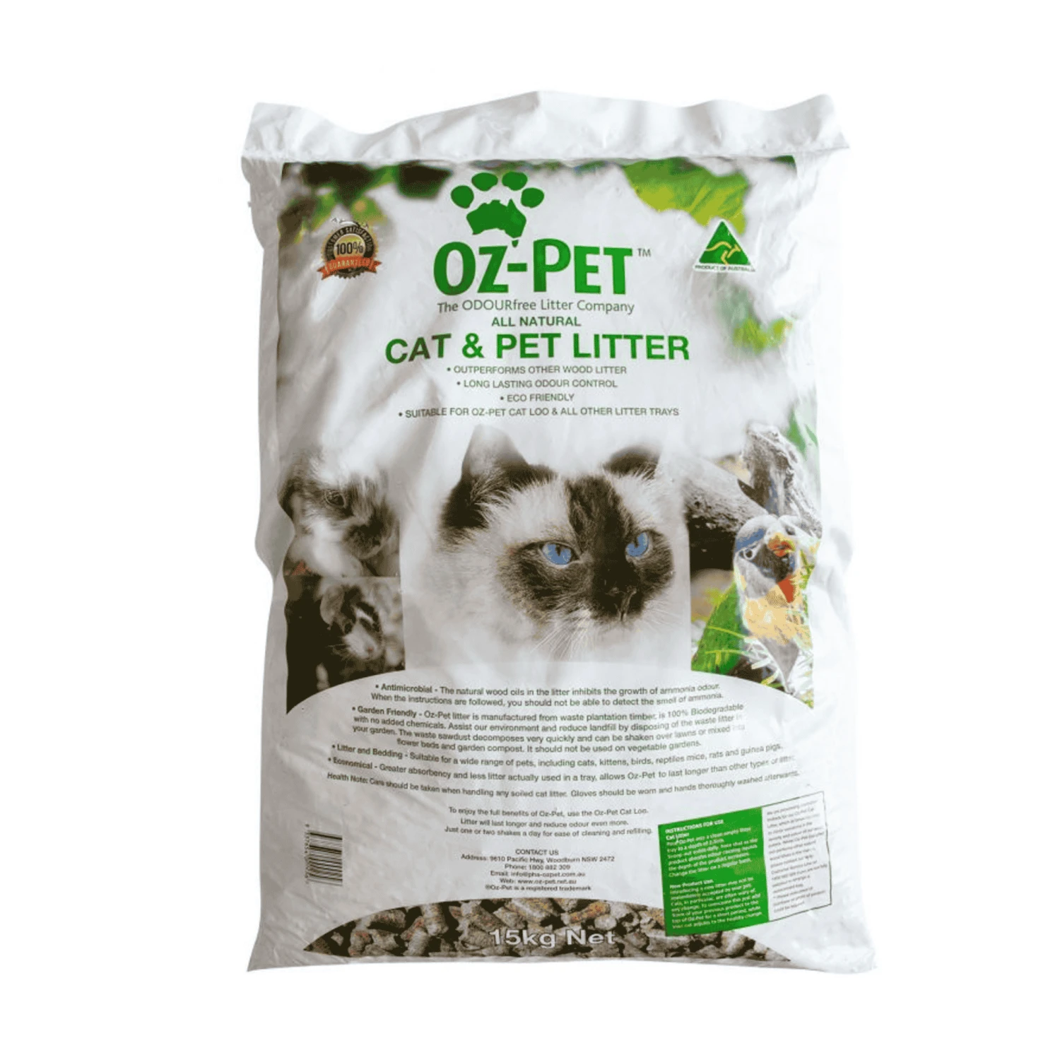 Oz-Pet Cat & Pet Litter is a natural anti-microbial litter that prevents strong urine smells in your litter tray by eliminating rather than masking the scent of ammonia. The eucalyptus oil in the recycled wood pellets stops bacterial growth that causes the ammonia smell.