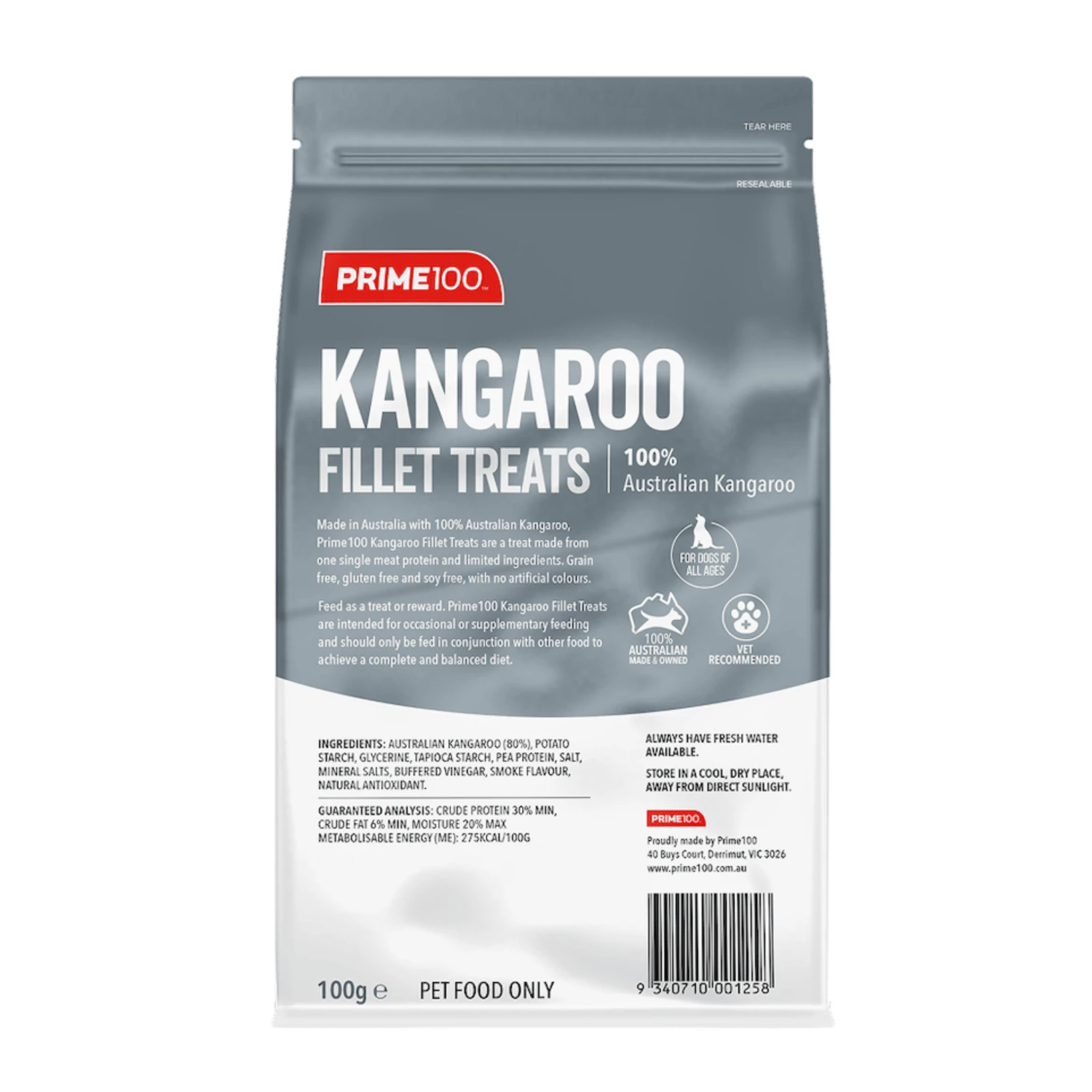 Made in Australia with 100% Australian Kangaroo, Prime100 Kangaroo Fillets are a treat made from one single meat protein and limited ingredients. Grain free, gluten free and soy free, with no artificial colours.