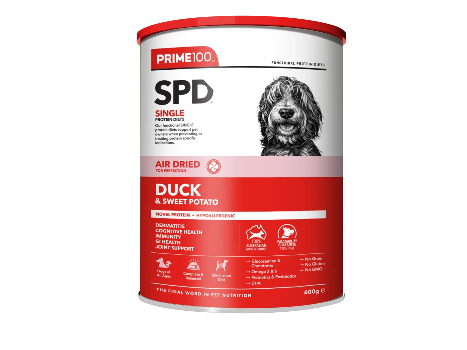 Prime100 SPD Air Dried Duck & Sweet Potato Adult Dry Dog Food is a vet approved, single-protein diet made from Australian Duck and sweet potato. Designed by science with hypoallergenic protein, functional and fresh ingredients to form a complete and balanced diet. Australian Duck protein delivers essential amino acids, glucosamine, chondroitin, calcium, and fatty acids (EFAs). The diet contains a carefully balanced calcium and phosphorous ratio vital for large, giant breeds and growing dogs. Sweet Potato provides a natural dietary fibre to support dogs with gastrointestinal issues. This diet is recommended for adult and senior dogs. Air Dried to Perfection.
