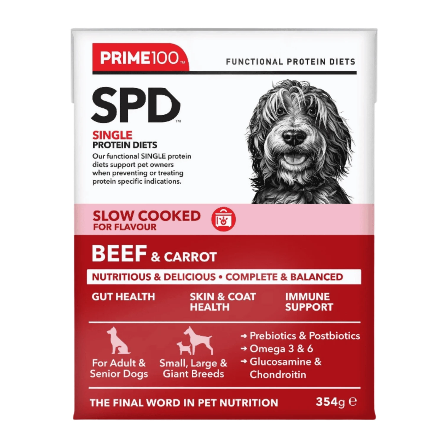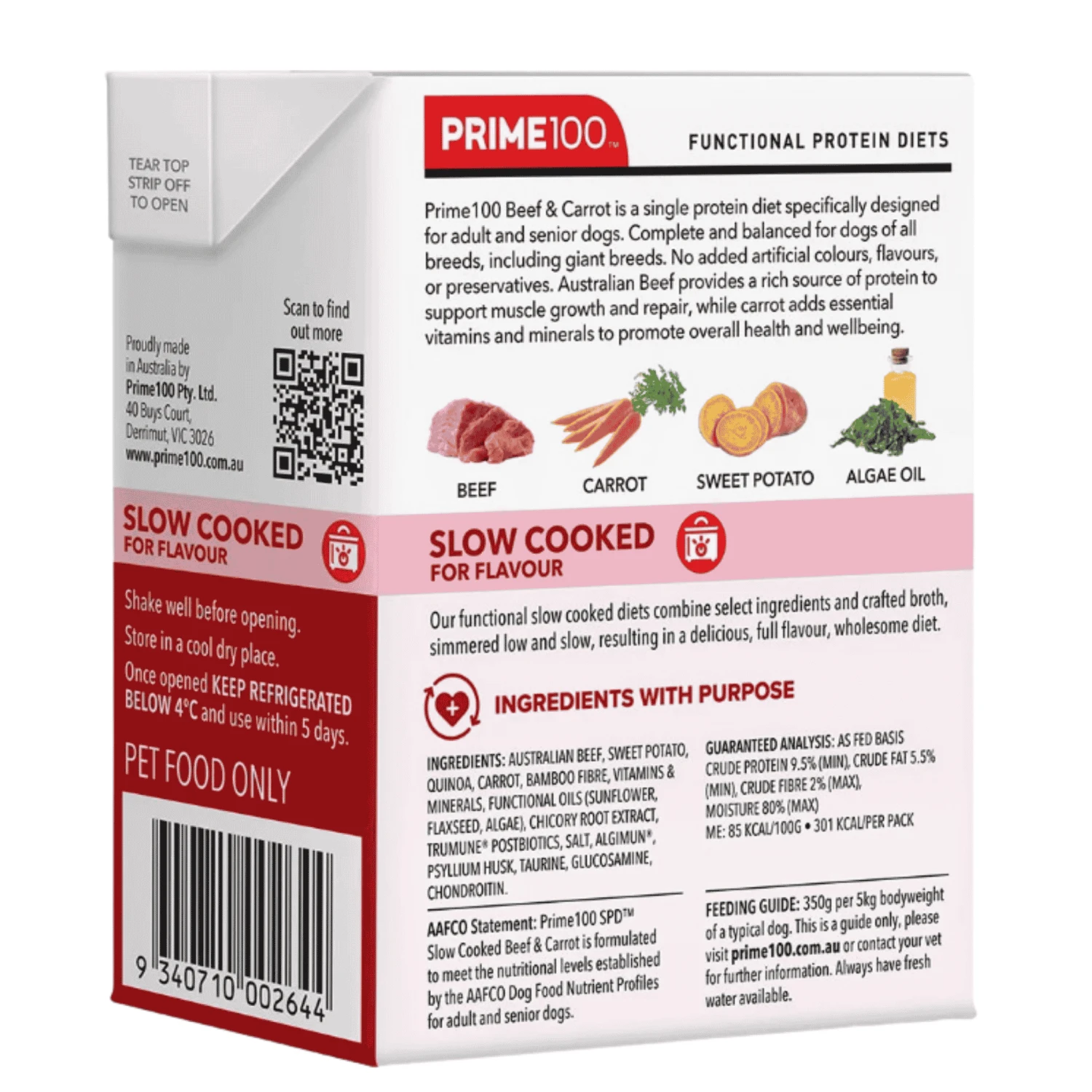 Prime100 Beef & Carrot is a single protein diet specifically designed for adult and senior dogs. Complete and balanced for dogs of all breeds, including giant breeds. No added artificial colours, flavours, or preservatives. Australian Beef provides a rich source of protein to support muscle growth and repair, while carrot adds essential vitamins and minerals to promote overall health and wellbeing.