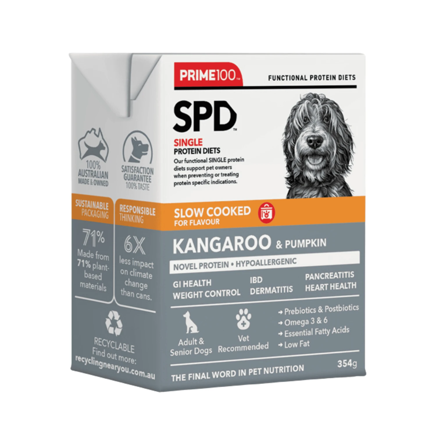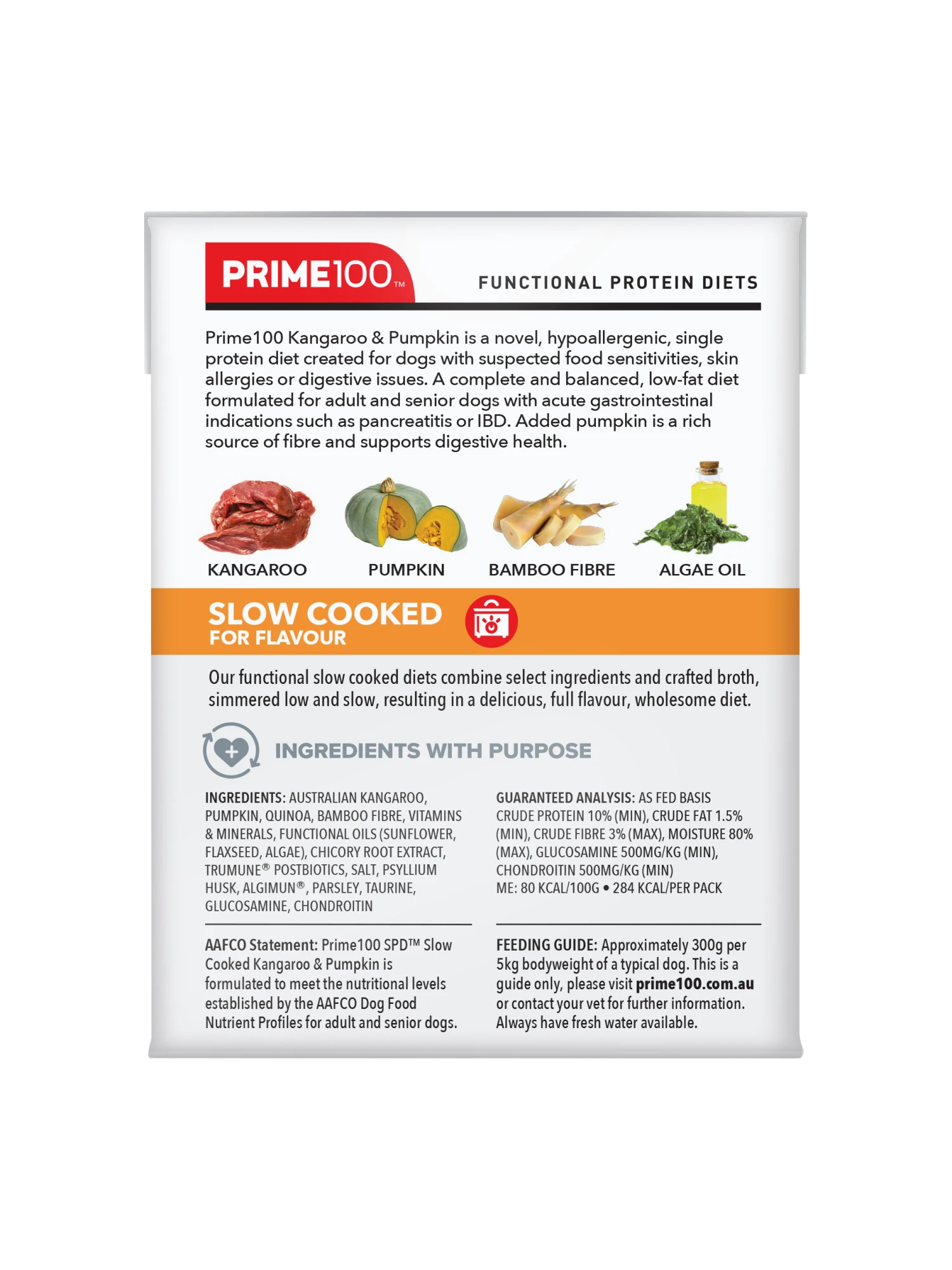Prime100 SPD™ Slow Cooked Kangaroo & Pumpkin is a novel, hypoallergenic, single protein diet created for dogs with suspected food sensitivities, skin allergies or digestive issues. A complete and balanced, low-fat diet formulated for adult and senior dogs with acute gastrointestinal indications such as pancreatitis or IBD. Added pumpkin is a rich source of fibre and supports digestive health.