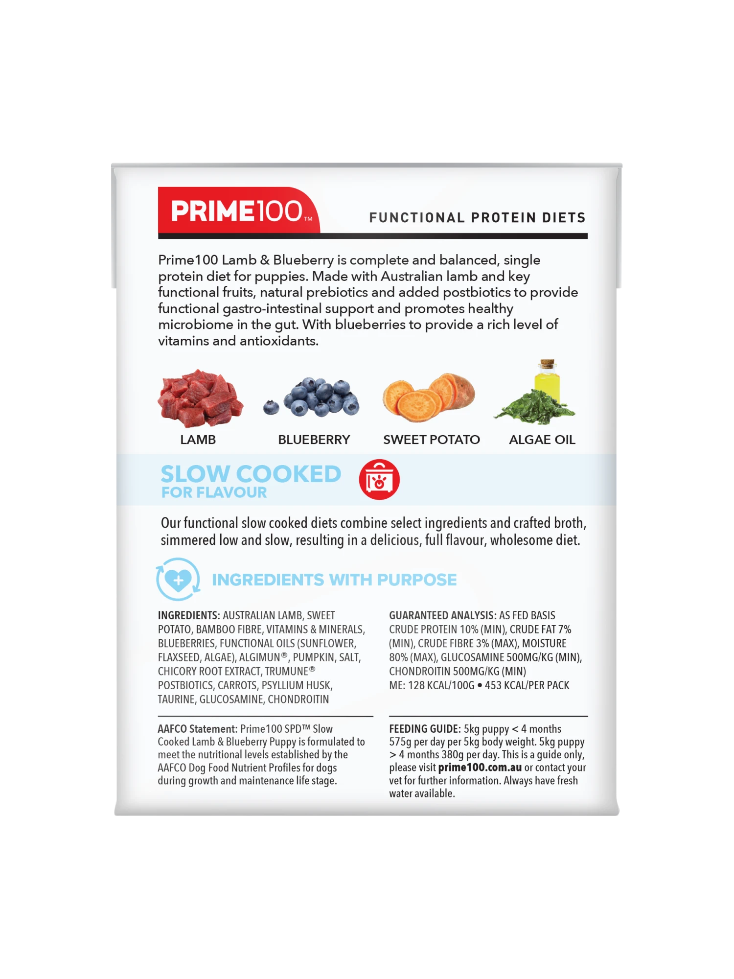 Prime100 SPD™ Slow Cooked Lamb & Blueberry Puppy is a complete and balanced, single protein diet for puppies. Made with Australian lamb and key functional fruits, natural prebiotics and added postbiotics to provide functional gastro-intestinal support and promotes healthy microbiome in the gut. With blueberries to provide a rich level of vitamins and antioxidants.