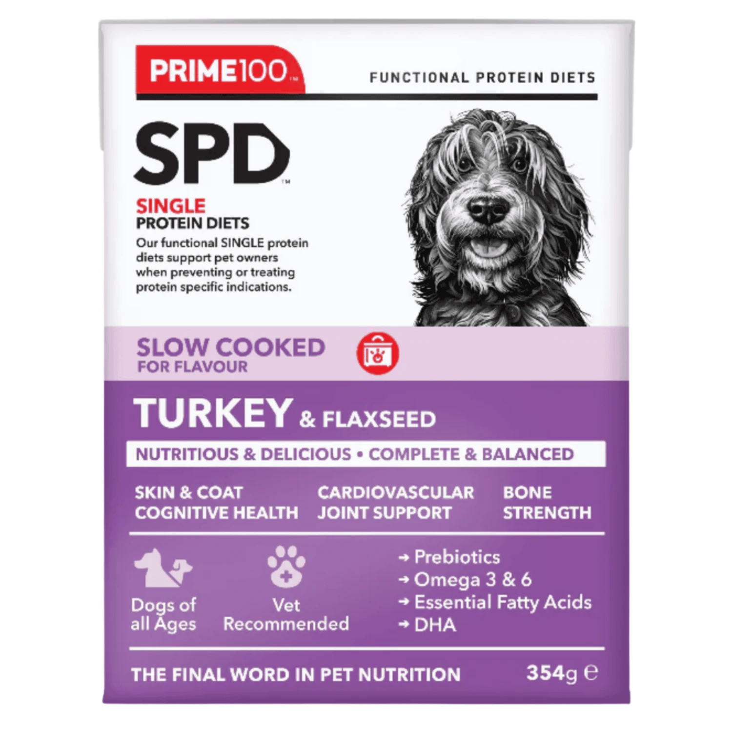 Prime100 Turkey & Flaxseed is a single protein diet designed to provide a single source of protein, prebiotics and fibre for dogs. Complete and balanced with a natural source of calcium, glucosamine, chondroitin, and essential fatty acids for dogs of all ages (excluding large & giant breed puppies). Formulated to improve and maintain skin health and to improve digestion through added natural digestive enzymes and fibre contained in flaxseeds.