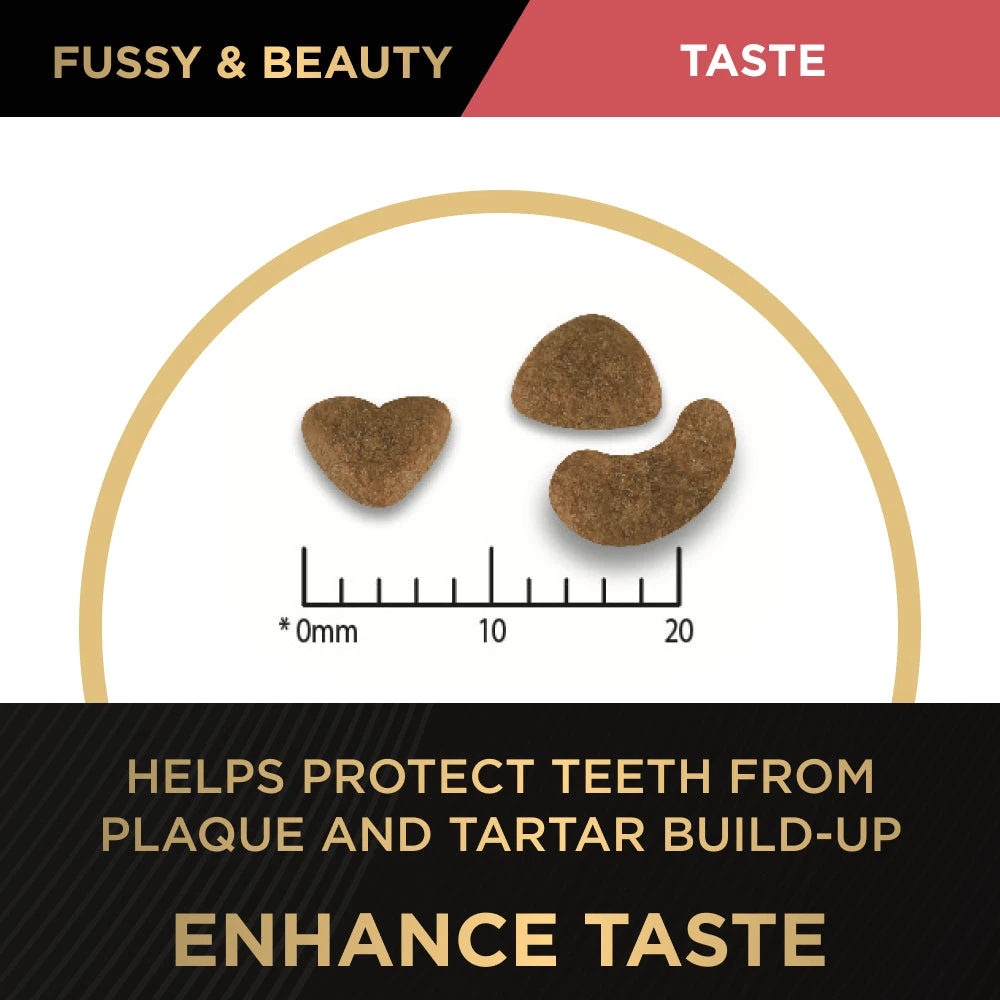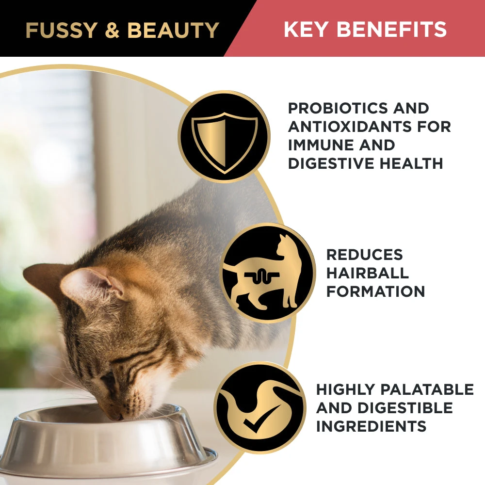 Pro Plan Fussy & Beauty Salmon Formula Dry Cat Food contains Omega-3 and 6 fatty acids and high protein.