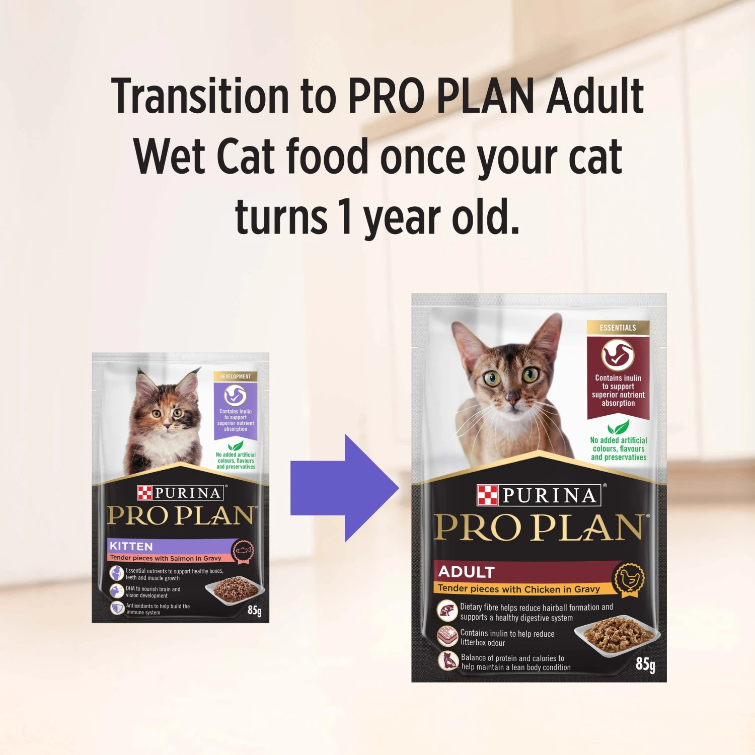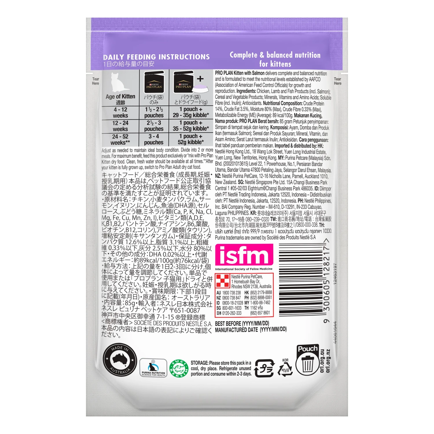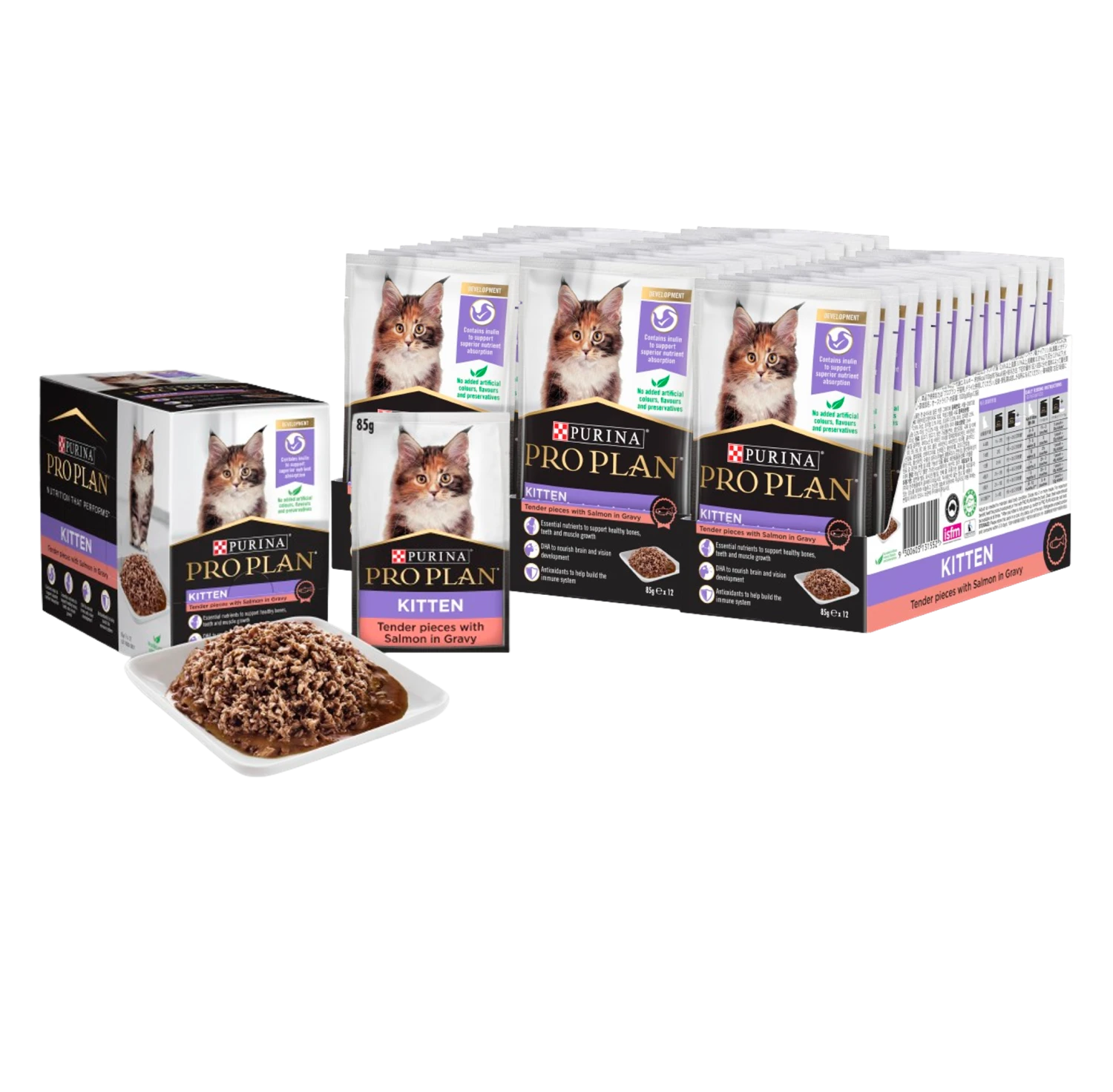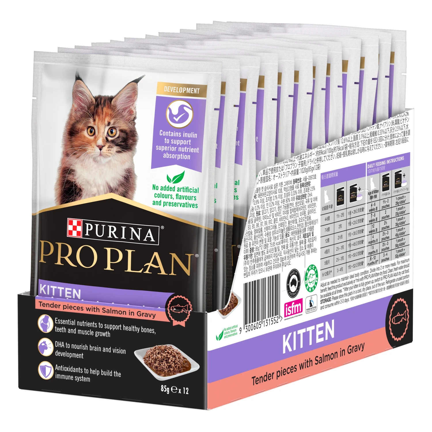 Pro Plan Kitten wet cat food is scientifically formulated to be 100% complete and balanced, containing all of the essential nutrients to support your kittens healthy bones, teeth and muscle growth. Pro Plan Kitten contains DHA to nourish the brain and vision development as well as antioxidant to help build the immune system enabling your kitten the best start at life. It is made with real Salmon in a gravy Jelly for a delicious flavour your Kitten will love.