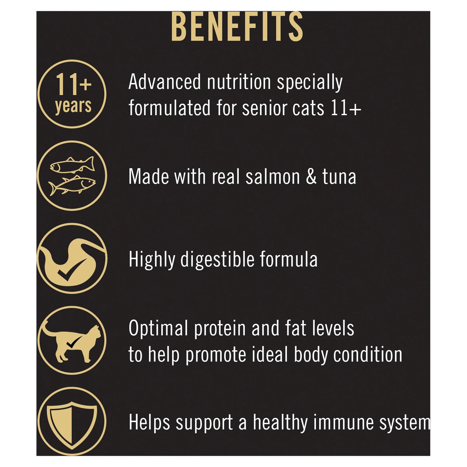 Highly digestible senior formula specially formulated to meet the needs of cats age 11+. Made with real salmon and tuna for a taste cats love, as well as vitamin A and taurine to support healthy vision.