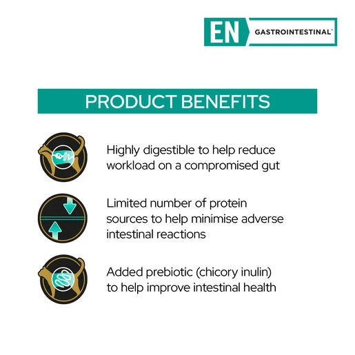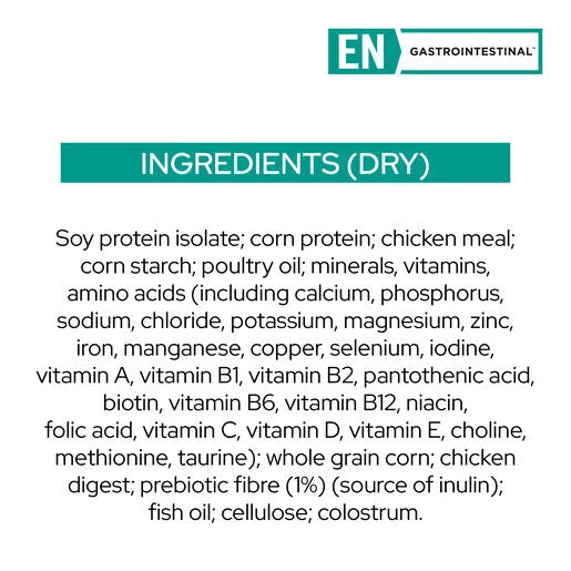 Purina® Pro Plan® Veterinary Diets Feline EN Gastrointestinal™ Formula is scientifically formulated for adult cats and kittens with highly digestible ingredients and prebiotics (source of fibre that helps to stimulate the good bacteria in the gut) and helps manage gastrointestinal conditions and supports gut health. Made with high-quality ingredients, the formula is energy-dense and includes b-complex vitamin and omega-3 fatty acids from fish oil.