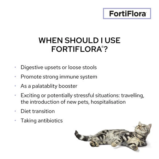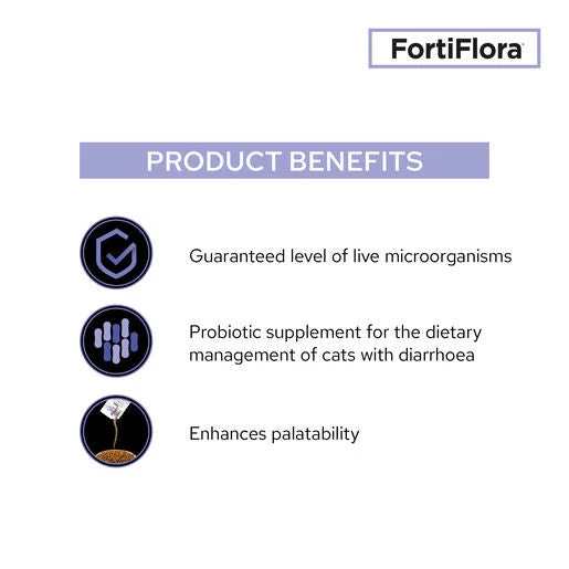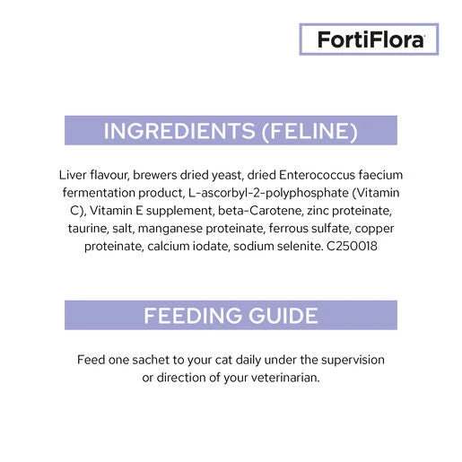 Purina Pro Plan Feline FortiFlora is a probiotic supplement for cats of all ages, including kittens. Live friendly bacteria found in FortiFlora support intestinal health and balance as well as a strong immune system. Guaranteed concentrations of a distinct probiotic strain are present in each sachet. It is very tasty and is simple to sprinkle on food.
