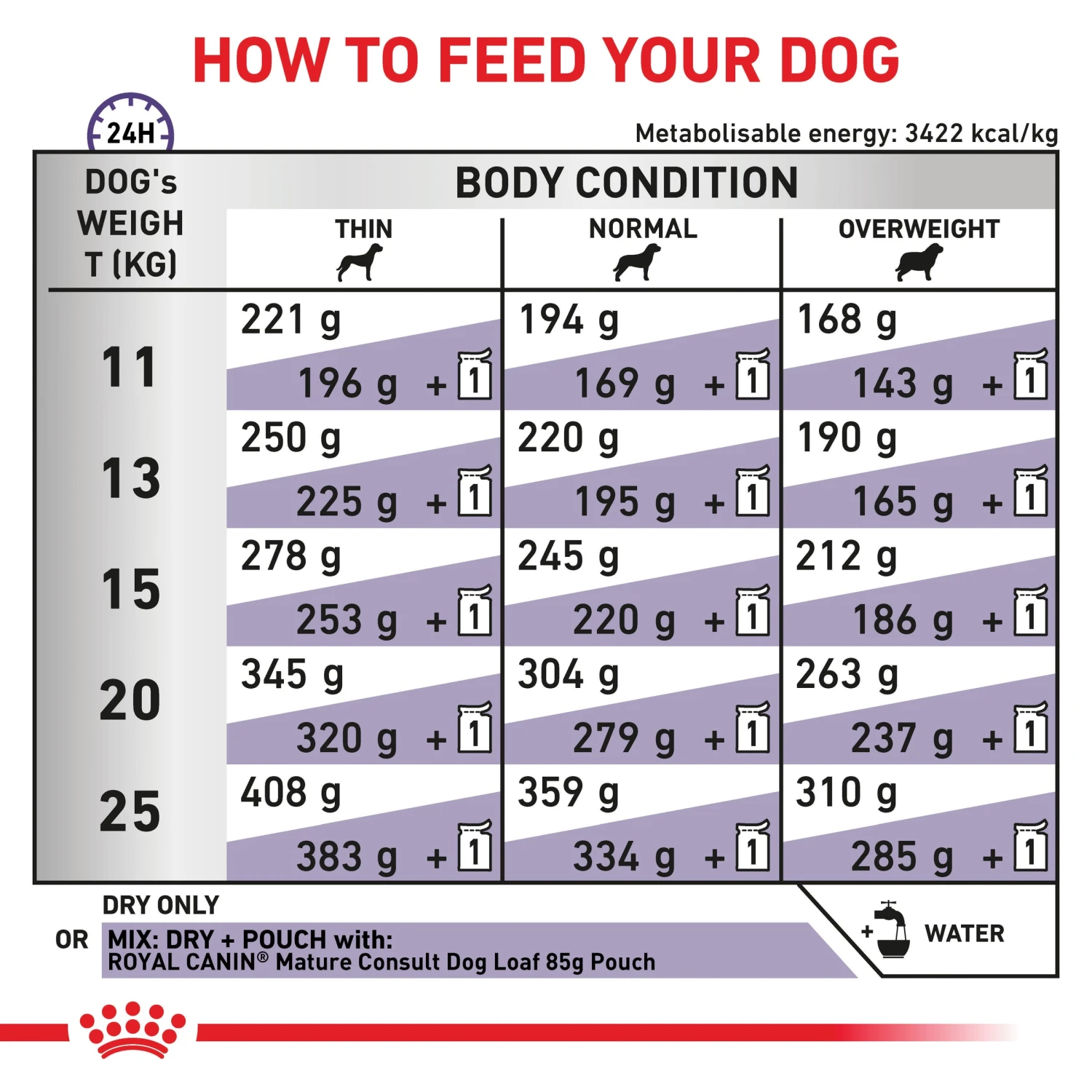 Royal Canin Mature Consult Medium Dog is recommended for mature medium breed dogs (11 to 25kg) over 7 years old, ideally after a senior health check.