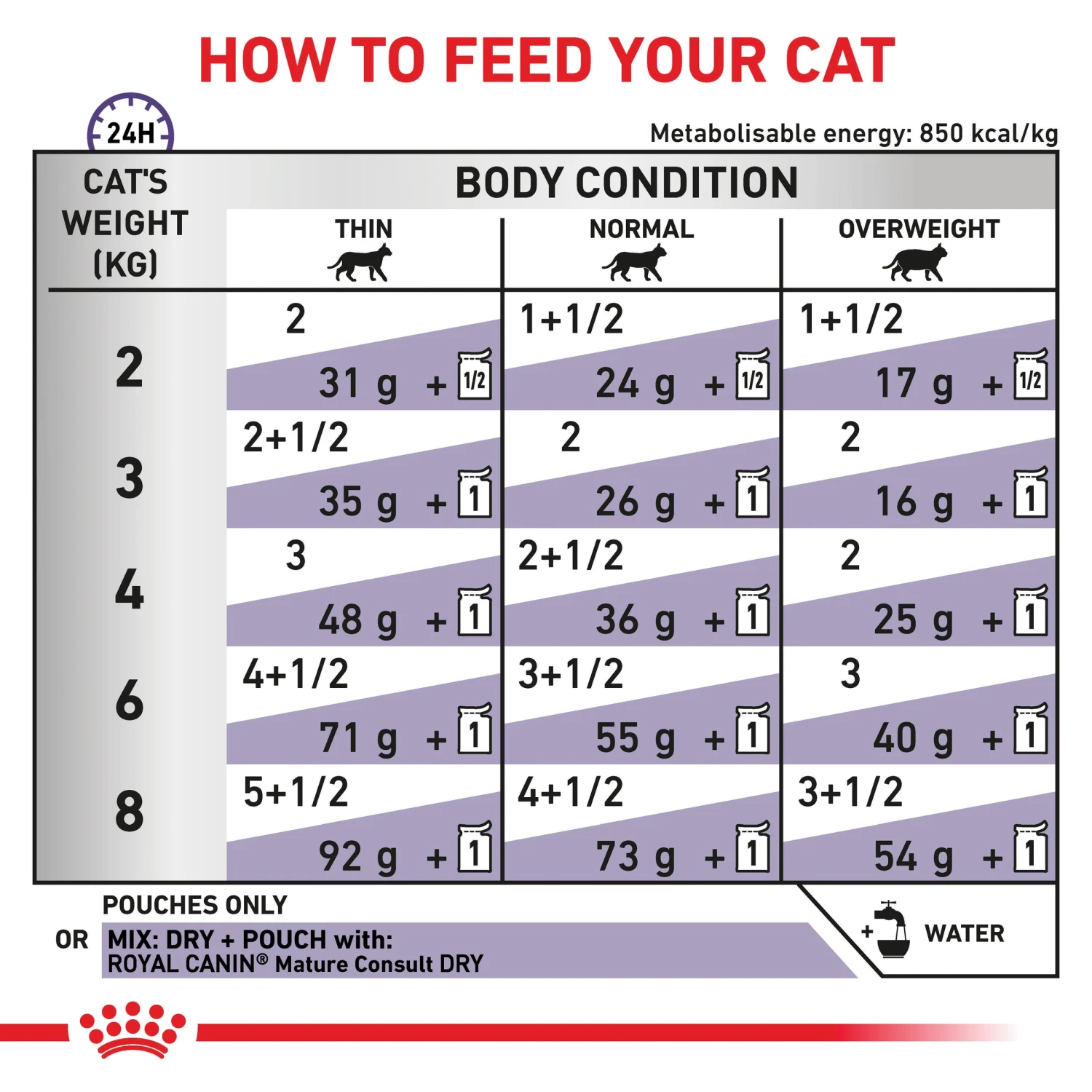 Royal Canin Mature Consult Wet Cat Food is recommended for mature cats over 7 years old without obvious ageing signs, ideally after a senior health check.
