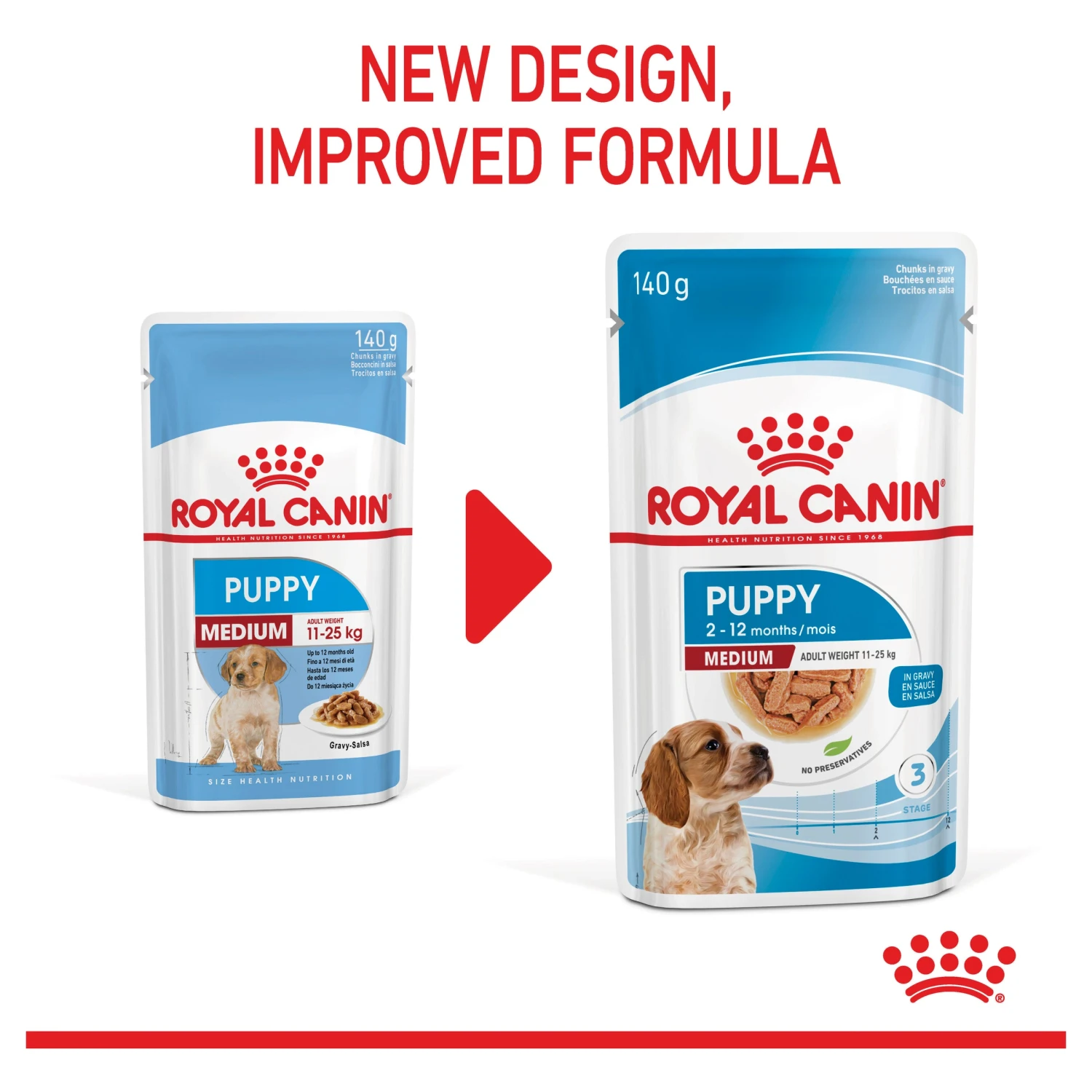 Royal Canin Medium Puppy in Gravy is specially formulated to support the nutritional needs of medium-sized puppies. This formula is suitable for 2 to 12-month-old puppies that should reach an adult weight of 11-25 kg.
