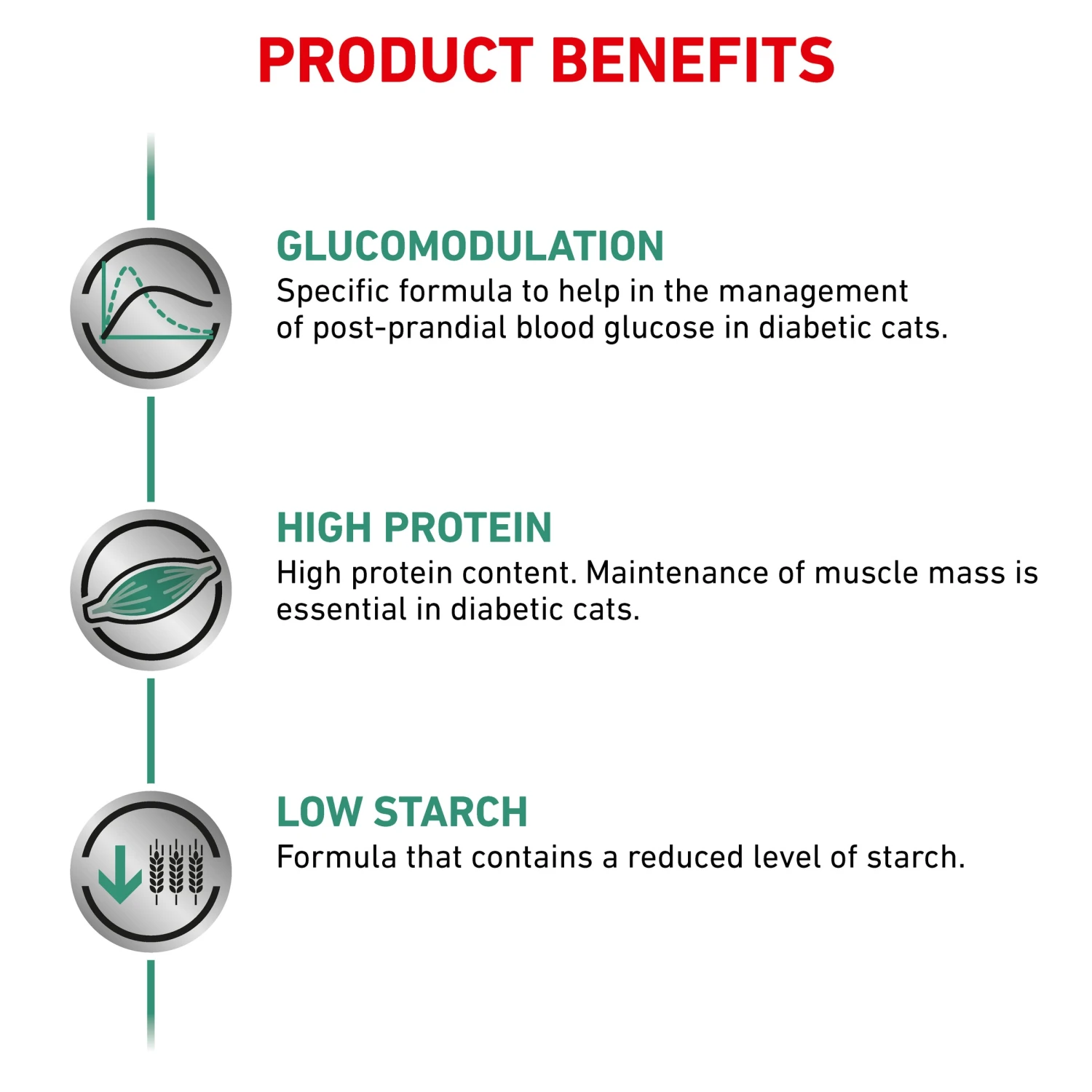 Specific formula to help in the management of post-prandial blood glucose in diabetic cats.