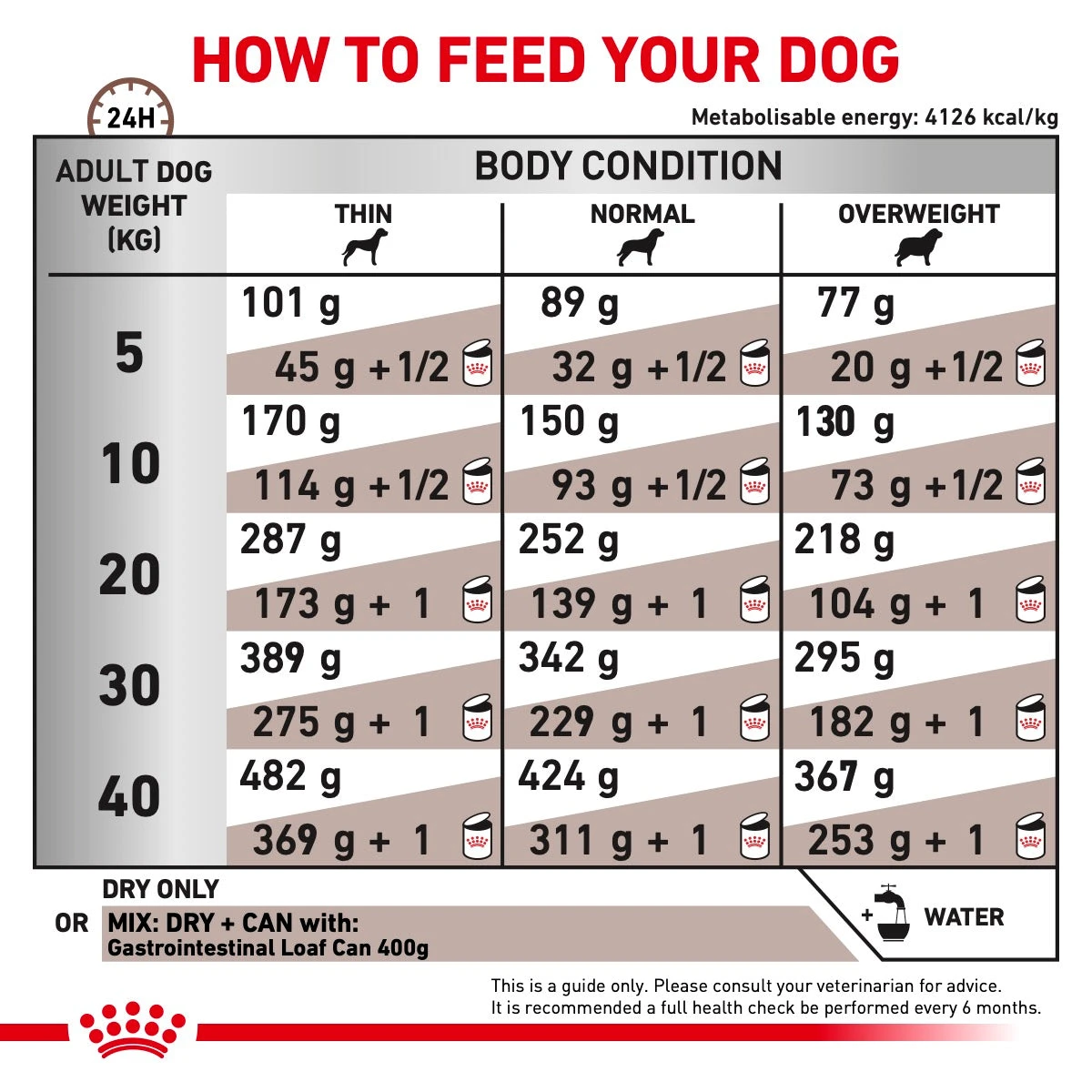 Royal Canin® Gastrointestinal is specifically formulated to help support your dog’s digestive health in cases of acute and chronic diarrhoea, maldigestion, or similar digestive sensitivities. A highly digestible formula with balanced fibres to support a healthy digestion and transit. A high energy content to reduce meal volume and decrease intestinal load. Formula with selected prebiotics to support a healthy gut and intestinal microbiome. It is recommended that a veterinarian’s opinion be sought before use. Feed Gastrointestinal dry up to 12 weeks.
