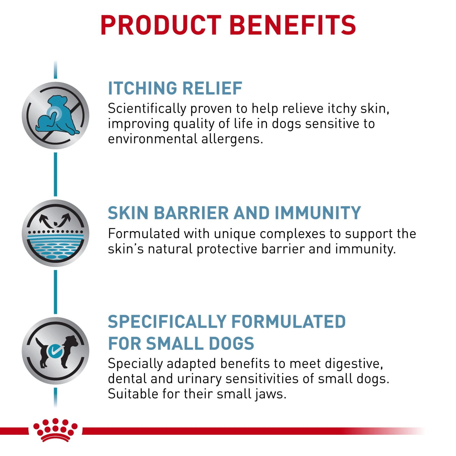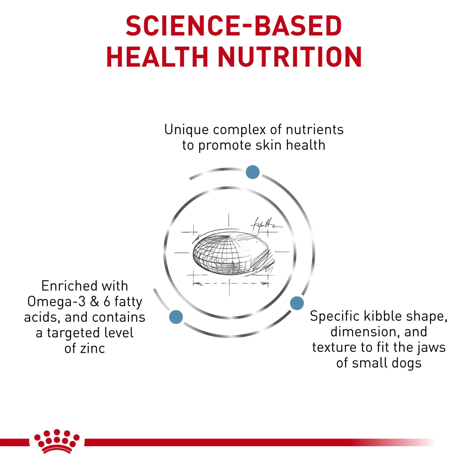 Royal Canin® Skintopic Small Dog is a complete diet for adult small breed dogs ≤10kg. The diet is formulated with a unique Dermauxilium™ complex of active compounds (including EPA/DHA and linoleic acid), clinically proven to help support optimal skin quality and coat health in dogs with skin disease such as atopic dermatitis (skin lesions and inflammation of the ear canal). Skintopic Small Dog is specifically tailored to the digestive, dental and urinary needs of small dogs, and is suitable for their small jaws.
