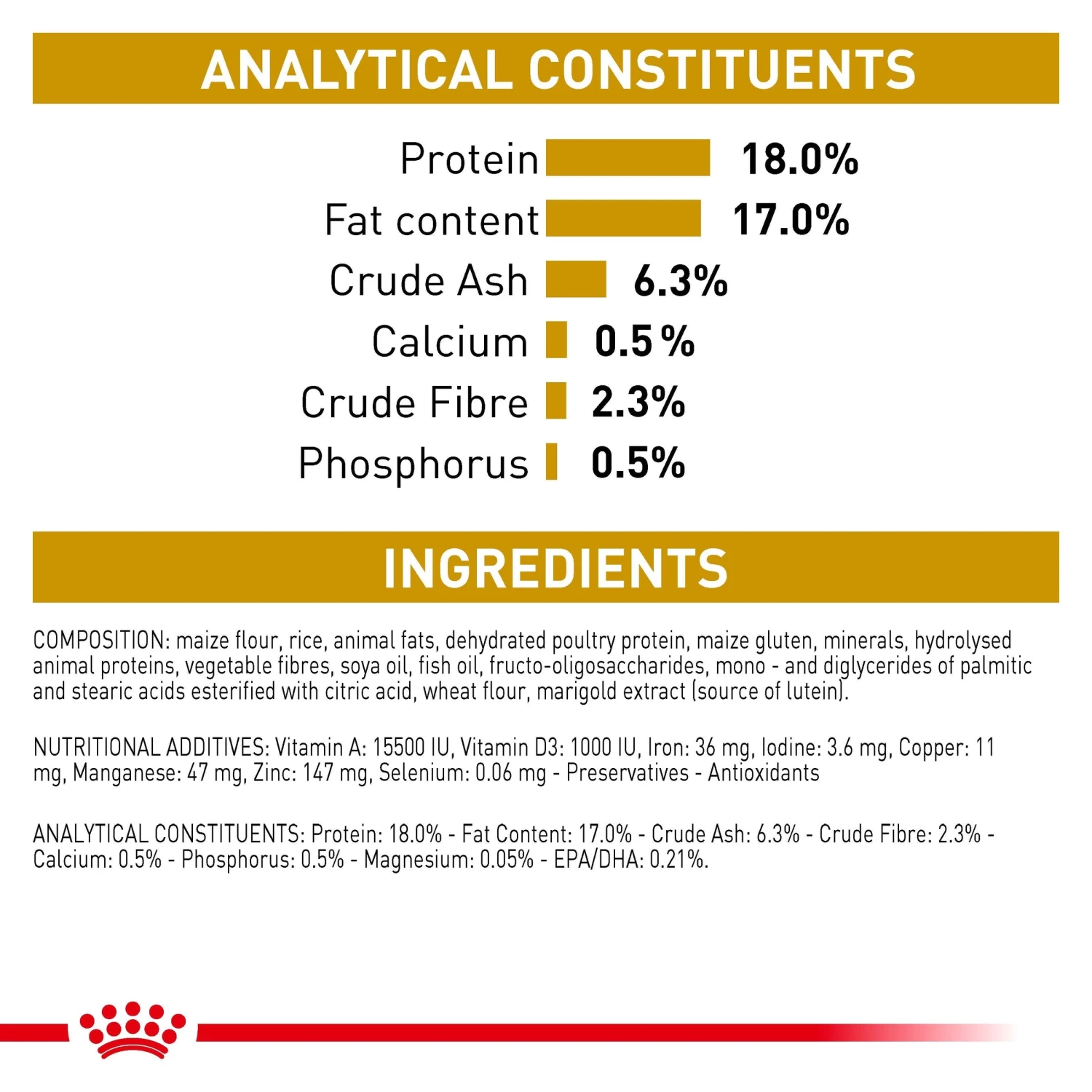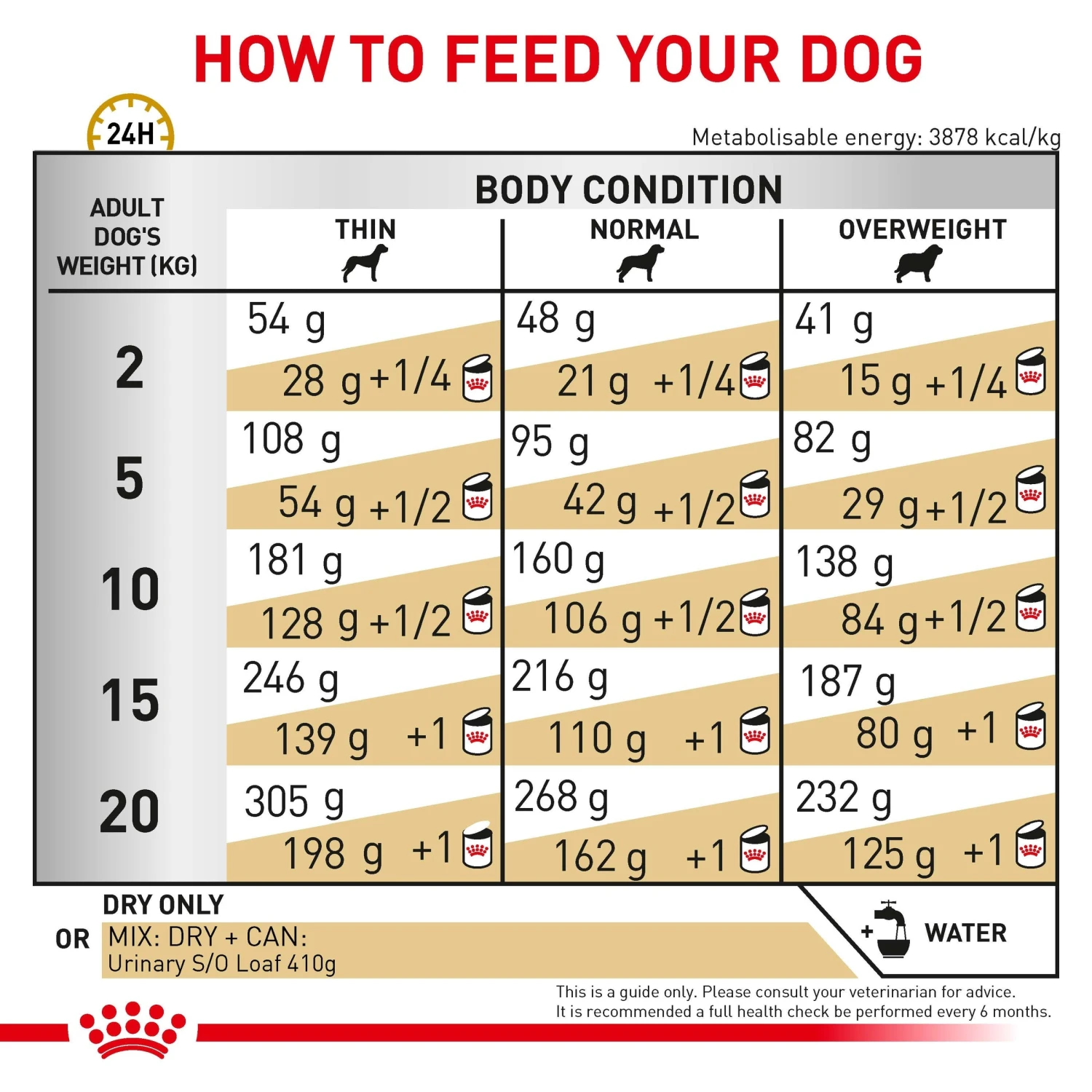 Royal Canin® Urinary S/O is a complete diet for adult dogs with urinary health concerns. This formula promotes a urinary environment unfavourable to the formation of both struvite and calcium oxalate crystals. It increases the amount of urine your dog produces to help dilute excess minerals that can cause crystals and stones. Relative Super Saturation (RSS) methodology is used to help lower ion concentration in urine, which contributes to stone formation. Additionally, this specialized nutrition with a reduced level of magnesium helps dissolve pure struvite stones and prevent struvite stones from forming.